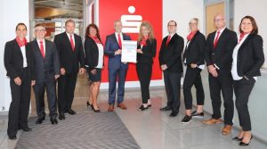 Der Bankentest der Gesellschaft für Qualitätsprüfung bescheinigt den Baufinanzierungsberatern der Sparkasse Kraichgau beste Beratungsqualität. Abteilungsdirektor Timo Richter und Susanne Bayer, Abteilungsleiterin Baufinanzierung (beide Mitte), freuen sich mit ihren Mitarbeitern über die Auszeichnung.