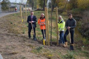 (von links) Gemeinsam pflanzten Oberbürgermeister Jörg Albrecht, Steffen Gschwind vom städtischen Grünflächenmanagement, Lothar Knödl und Gerold Werner Winterlinden entlang des Ilvesbaches.