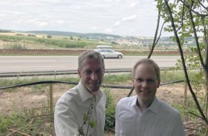 Jochen Haußmann MdL (li.) und Dr. Jens Brandenburg an der A 6 mit freiem Blick auf Hoffenheim und den Großen Wald