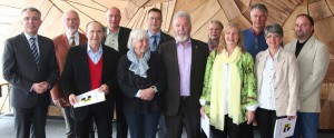 Landrat Stefan Dallinger (links) und den Personalratsvorsitzenden Martin Streib (rechts) zusammen mit den in den Ruhestand verabschiedeten Mitarbeiterinnen und Mitarbeitern des Rhein-Neckar-Kreises (von links): Herbert Jung, Dr. Franz Bach, Klaus Conrath, Dr. Oswinde Bock-Hensley, Alfred Fleck, Bertold Kneißl, Dr. Barbara Groth, Monika Pfitzner, Rainer Steen und Gabriele Schimming