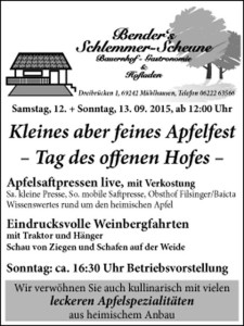 Am Samstag den 12. September und Sonntag den 13. September 2015 findet das 1. Apfelfest und Tag des offenen Hofes in Bender`s Schlemmer-Scheune & Hofladen statt.