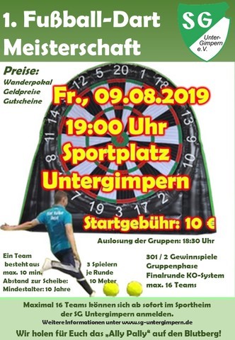 Nach dem großen Erfolg bei der ersten Dartmeisterschaft im März diesen Jahres, als die Teilnehmer im Sportheim der SG Untergimpern mit Pfeilen auf die Dartscheiben geworfen haben, findet am Freitag, 09.08.2019 nun der nächste große Event auf dem „Blutberg“ in Untergimpern statt.