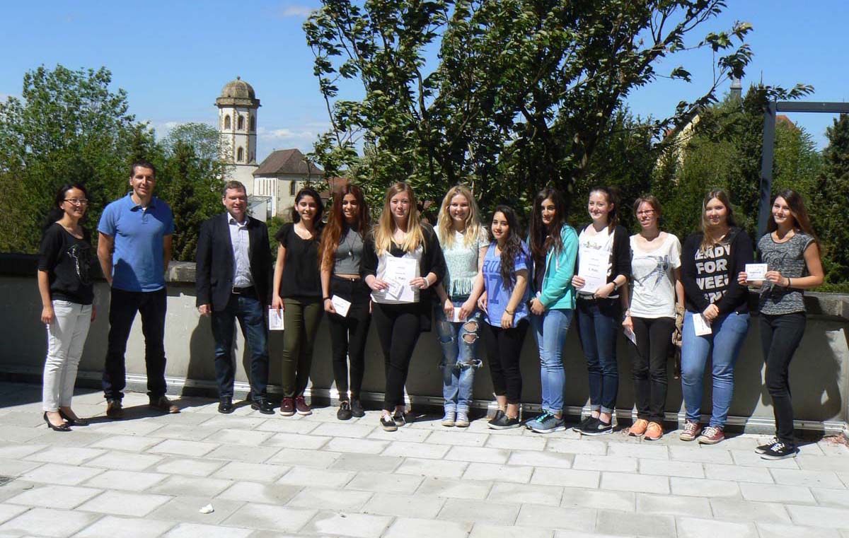 Schulleiter Holger Gutwald-Rondot überreichte den erfreuten Schülerinnen Ayse Cingi, Kerstin Petri, Lisa Pohl, Maike Gobernatz, Prsha Saleh und Selina Alirizova (jetzt10d) sowie Lena Elsässer, Emine Dirican, Lena Nachbar, Melissa Bauer und Judith Brünner (jetzt 10a) den von der BB-Bank gesponserten Preis.