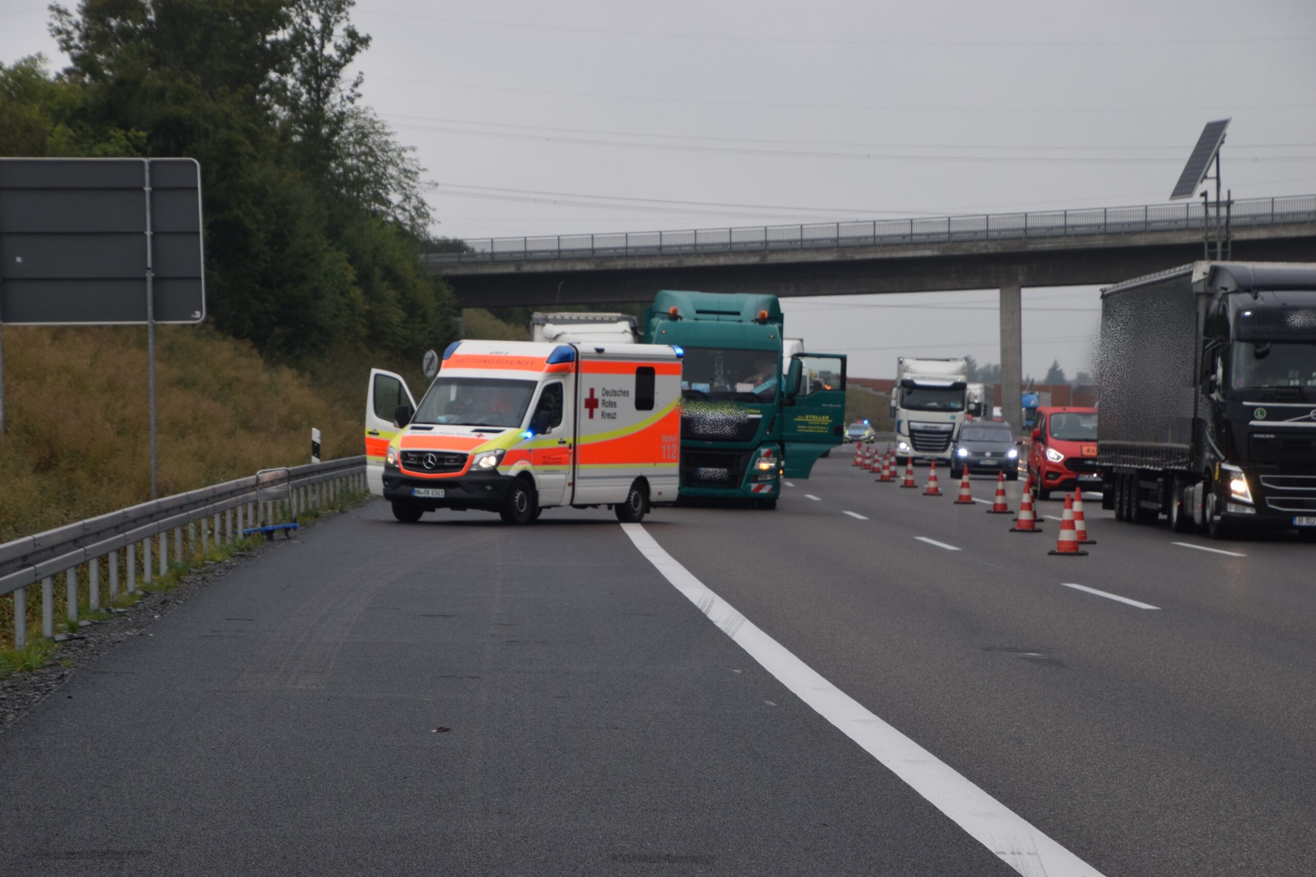 Ein Lastwagenfahrer wurde verletzt und wird derzeit vom Rettungsdienst behandelt. Die Fahrbahn muss aufgrund der Verunreinigungen im Nachgang aufwändig gereinigt werden.