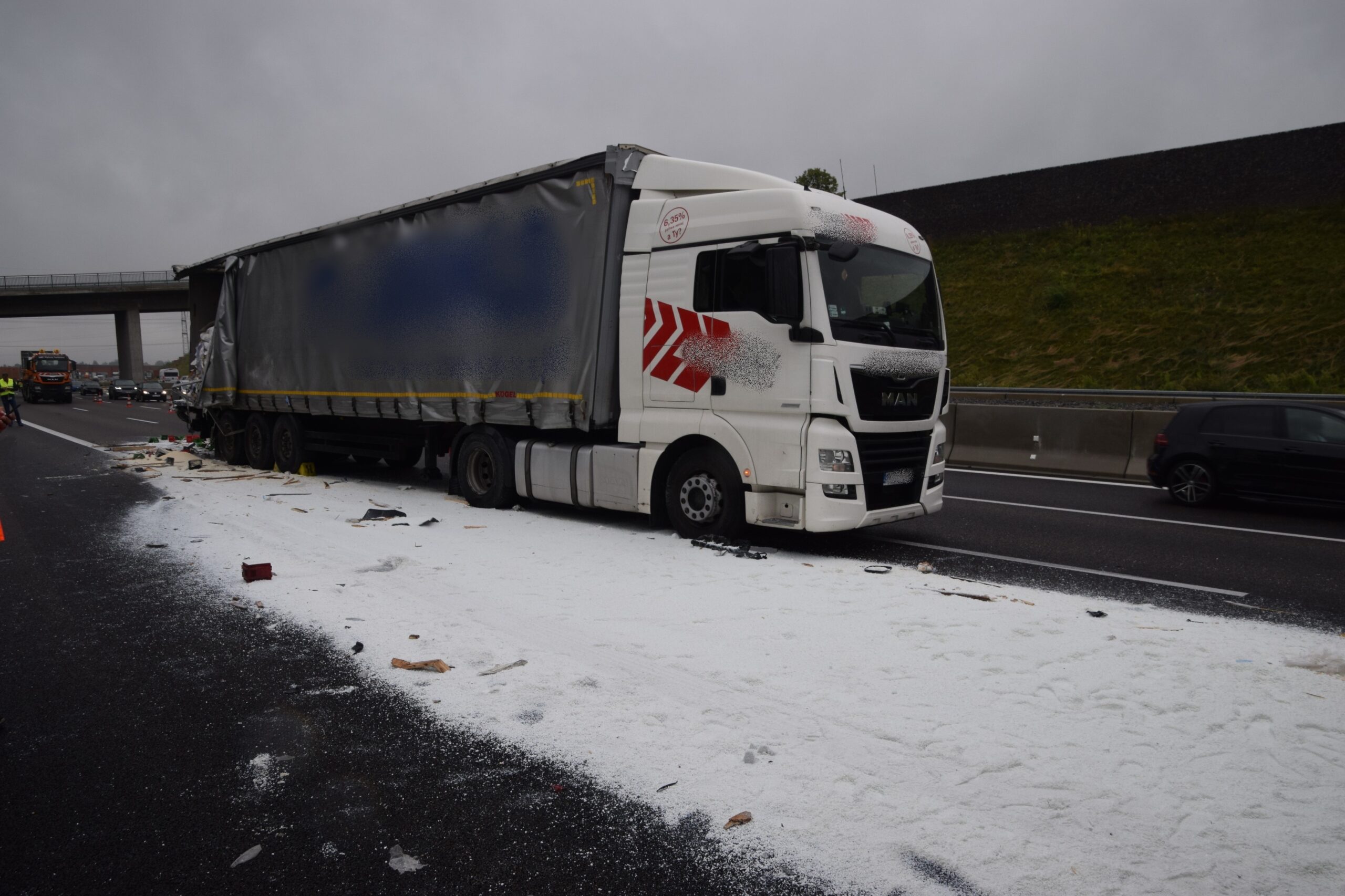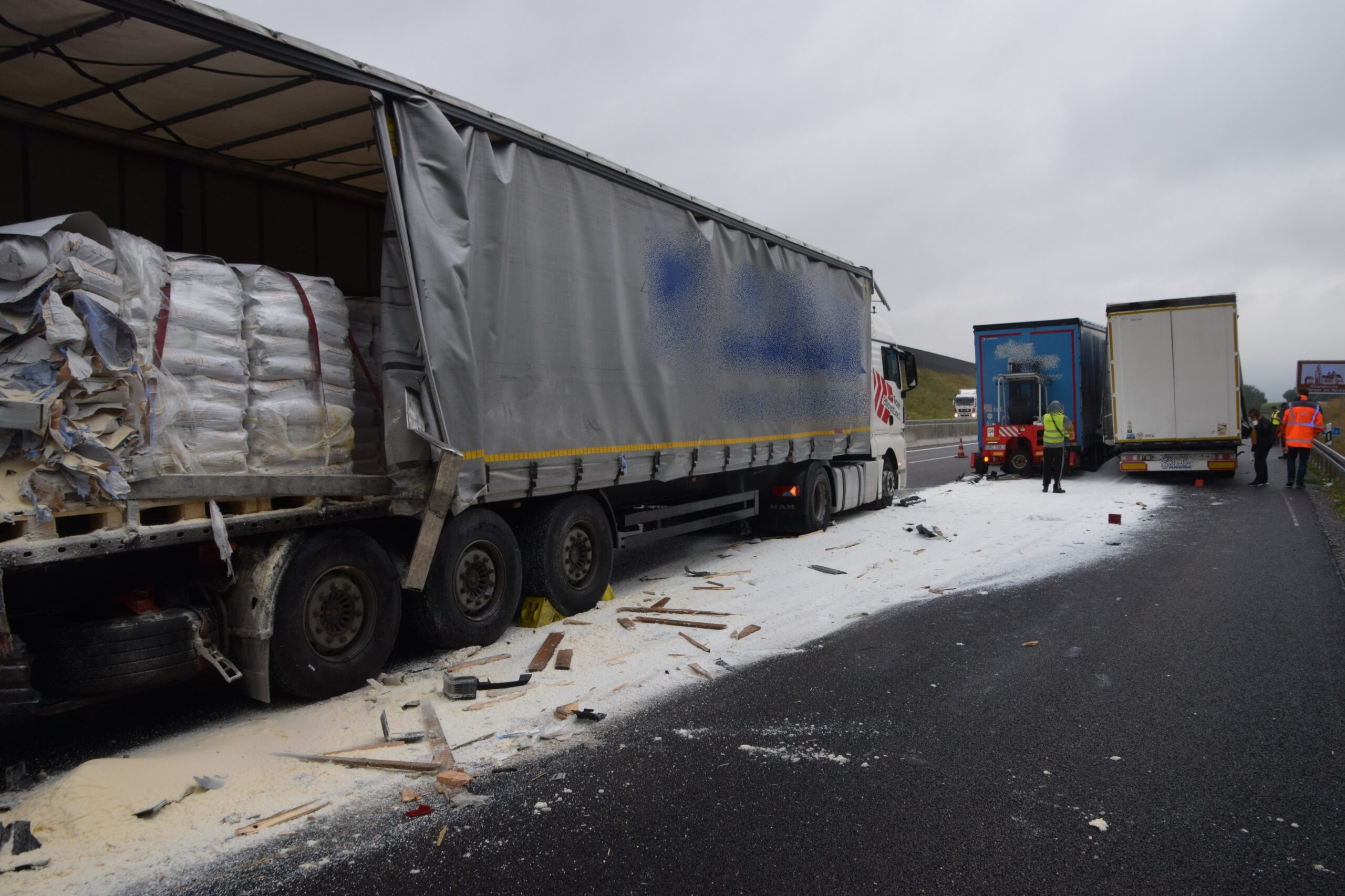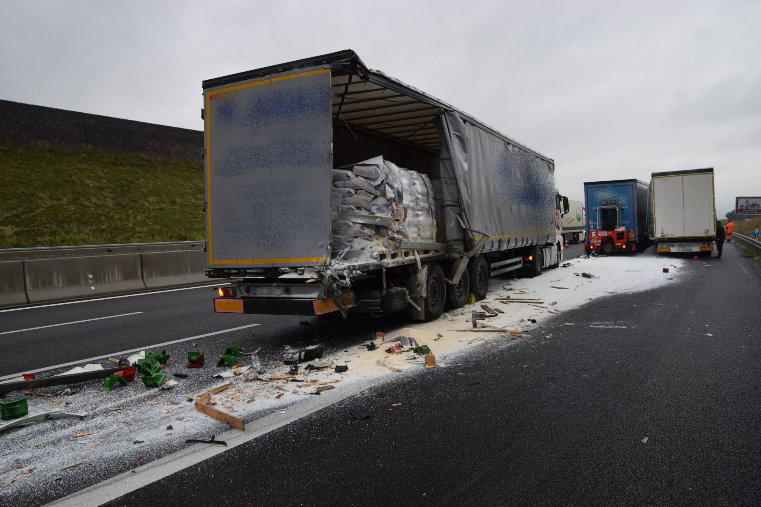 Gegen 09.20 Uhr war es zu einer Kollision mit drei beteiligten Lastwagen auf der rechten Spur gekommen. Ein LKW riss bei der Kollision auf und es verteilte sich Gelatine auf der Fahrbahn. Über den Unfallhergang liegen bislang keine gesicherten Angaben vor.