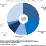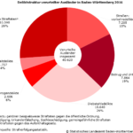Unter den insgesamt 102 600 gerichtlich Verurteilten besaßen 40 600 Personen eine ausländische Staatsangehörigkeit. Ihre Zahl ist 2016 gegenüber dem Vorjahr um 3 400 bzw. 9,2 % gestiegen und war lediglich in den Jahren 1993 und 1994 noch höher. Die Zahl der verurteilten Deutschen ist 2016 im Vergleich zum Vorjahr um 3 400 oder 5,2 % auf 62 000 gefallen. Damit setzte sich die gegenläufige Entwicklung dieser Verurteiltengruppen, die bereits seit dem Jahr 2011 zu beobachten ist, weiter fort. Bezogen auf die Gesamtzahl der Verurteilungen hatten 2016 insgesamt 39,6 % der Verurteilten eine ausländische Nationalität. Gegenüber dem Vorjahr erhöhte sich damit der Anteil der ausländischen Verurteilten um 3,4 Prozentpunkte. Hierfür war vor allem der Zuwachs um 9,9 % (+3 300 Verurteilte) bei den Erwachsenen mit ausländischer Staatsangehörigkeit ausschlaggebend. Bei der Betrachtung der ausländischen Verurteiltenzahlen ist allerdings zu berücksichtigen, dass in Baden‑Württemberg die ausländische Bevölkerung im strafmündigen Alter gegenüber dem Vorjahr besonders stark zugenommen hat (+129 300 Personen bzw. +10,3 %). Insgesamt war der Bevölkerungszuwachs bei der ausländischen Bevölkerung also stärker als der prozentuale Zuwachs der ausländischen Verurteilten, sodass die Verurteiltenhäufigkeit bei den ausländischen Verurteilten 2016 gegenüber dem Vorjahr um 1 % zurückging. Bei der deutschen Bevölkerung sank die Verurteiltenhäufigkeit um 5,3 %.