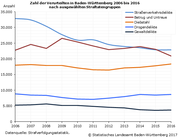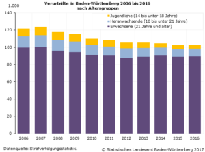Im Jahr 2016 wurden in Baden‑Württemberg rund 102 600 Personen vor Gericht schuldig gesprochen. Gegenüber 2015 wurden 12 Personen mehr verurteilt. Damit lag die Zahl der gerichtlich Verurteilten 2016 faktisch auf dem Niveau des Vorjahres. Gleichwohl zeigt das Ergebnis, dass sich der seit dem Jahr 2007 zu beobachtende Rückgang der Verurteiltenzahl nicht weiter fortgesetzt hat. Ursächlich hierfür ist der Anstieg der verurteilten Erwachsenen im Alter von mindestens 21 Jahren um 550 Personen bzw. 0,6 % auf 89 500 Personen. In der Gruppe der Heranwachsenden im Alter von 18 bis unter 21 Jahren und der Jugendlichen im Alter von 14 bis unter 18 Jahren setzten sich die seit 2007 zu beobachtenden rückläufigen Trends bei der Verurteiltenzahl bis in das Jahr 2016 weiter fort. So ging die Zahl der Schuldsprüche gegenüber dem Vorjahr bei den Heranwachsenden um 3,2 % bzw. 300 Personen auf 9 000 Verurteilte zurück. In der Gruppe der Jugendlichen war der Rückgang der Verurteiltenzahl um 5,5 % oder 240 Personen auf nunmehr 4 100 deutlich stärker. Dies sagte die Präsidentin des Statistischen Landesamtes, Dr. Carmina Brenner, heute auf einer Pressekonferenz mit dem Minister der Justiz und für Europa, Guido Wolf, bei der Präsentation der aktuellen Ergebnisse der Strafverfolgungsstatistik.
