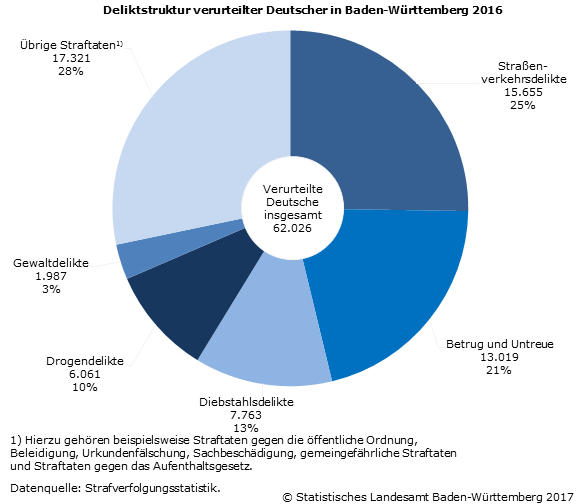 Im Jahr 2016 entfielen rund drei Viertel der insgesamt 102 600 gerichtlichen Schuldsprüche auf fünf Straftatengruppen. An erster Stelle standen mit einem Anteil von 22,3 % an allen verurteilten Straftaten die Straßenverkehrsdelikte, noch vor Betrug und Untreue (20,3 %) und Diebstahlsdelikten (17,9 %). Verurteilungen wegen Drogen- und Gewaltdelikten waren mit Anteilen von 8,4 bzw. 3,6 % im Vergleich dazu deutlich seltener1. Bezüglich der Struktur zeigen sich allerdings deutliche Unterschiede bei deutschen und ausländischen Personen. So standen 2016 bei den verurteilten Deutschen die Straßenverkehrsdelikte an erster Stelle (25,2 %), noch vor Betrug und Untreue (21 %) und Diebstahlsdelikten (12,5 %). Verurteilungen wegen Drogen- und Gewaltdelikten folgten erst mit Abstand (9,8 bzw. 3,2 %). Personen mit ausländischer Nationalität wurden dagegen am häufigsten wegen Diebstahls (26,2 %), Betrugs und Untreue (19,4 %) und Straßenverkehrsdelikten (17,7 %) verurteilt. Verurteilungen wegen Drogen- und Gewaltdelikten (6,4 bzw. 4,2 %) waren im Vergleich dazu wie bei den deutschen auch bei den ausländischen Verurteilten deutlich seltener. Insgesamt spiegelt sich in den fünf großen Straftatengruppen die gegenläufige Entwicklung der Zahl der Verurteilungen von deutschen und ausländischen Personen wider. Im Vergleich zum Vorjahr ging 2016 die Zahl der deutschen Verurteilten in allen fünf genannten Straftatengruppen zurück, während die Zahl der Schuldsprüche gegen Personen mit ausländischer Nationalität mit Ausnahme der Verurteilungen wegen Betrugs und Untreue in allen anderen großen Deliktgruppen zunahm.