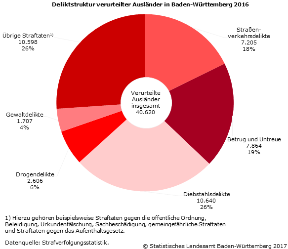 Unter den insgesamt 102 600 gerichtlich Verurteilten besaßen 40 600 Personen eine ausländische Staatsangehörigkeit. Ihre Zahl ist 2016 gegenüber dem Vorjahr um 3 400 bzw. 9,2 % gestiegen und war lediglich in den Jahren 1993 und 1994 noch höher. Die Zahl der verurteilten Deutschen ist 2016 im Vergleich zum Vorjahr um 3 400 oder 5,2 % auf 62 000 gefallen. Damit setzte sich die gegenläufige Entwicklung dieser Verurteiltengruppen, die bereits seit dem Jahr 2011 zu beobachten ist, weiter fort. Bezogen auf die Gesamtzahl der Verurteilungen hatten 2016 insgesamt 39,6 % der Verurteilten eine ausländische Nationalität. Gegenüber dem Vorjahr erhöhte sich damit der Anteil der ausländischen Verurteilten um 3,4 Prozentpunkte. Hierfür war vor allem der Zuwachs um 9,9 % (+3 300 Verurteilte) bei den Erwachsenen mit ausländischer Staatsangehörigkeit ausschlaggebend. Bei der Betrachtung der ausländischen Verurteiltenzahlen ist allerdings zu berücksichtigen, dass in Baden‑Württemberg die ausländische Bevölkerung im strafmündigen Alter gegenüber dem Vorjahr besonders stark zugenommen hat (+129 300 Personen bzw. +10,3 %). Insgesamt war der Bevölkerungszuwachs bei der ausländischen Bevölkerung also stärker als der prozentuale Zuwachs der ausländischen Verurteilten, sodass die Verurteiltenhäufigkeit bei den ausländischen Verurteilten 2016 gegenüber dem Vorjahr um 1 % zurückging. Bei der deutschen Bevölkerung sank die Verurteiltenhäufigkeit um 5,3 %.