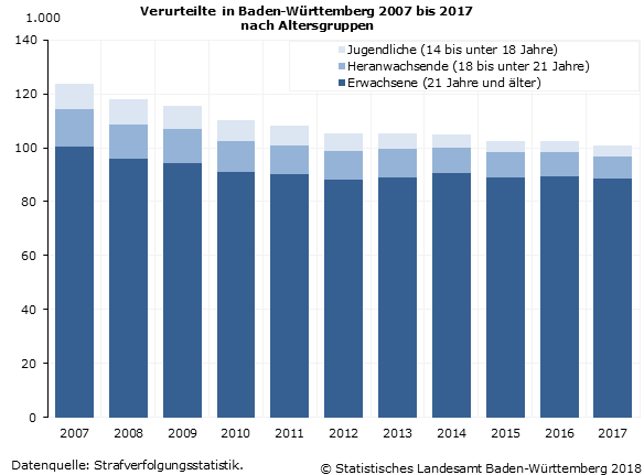 Im Jahr 2017 wurden in Baden-Württemberg rund 100 7001 Personen vor Gericht schuldig gesprochen. Gegenüber 2016 waren dies rund 2 000 Personen oder 1,9 Prozent weniger. Wie das Statistische Landesamt nach Auswertung der Strafverfolgungsstatistik 2017 weiter mitteilte, hat sich damit mit Ausnahme von 2016 der seit dem Jahr 2007 zu beobachtende Rückgang der Verurteiltenzahl weiter fortgesetzt. Besonders positiv ist, dass der Rückgang in allen Altersgruppen festzustellen war. Prozentual am stärksten war er in der Gruppe der Jugendlichen im Alter von 14 bis unter 18 Jahren um 7,2 Prozent oder 300 Verurteilte auf nunmehr rund 3 800 Verurteilte. In der Gruppe der Heranwachsenden im Alter von 18 bis unter 21 Jahren ging die Zahl der Schuldsprüche um 6,8 % (–600 Personen) auf 8 400 Verurteilte zurück. Nachdem bei den Erwachsenen der Altersgruppe 21 Jahre und älter 2016 gegenüber dem Vorjahr ein Anstieg der Verurteiltenzahl zu beobachten war, ging die Zahl der Schuldsprüche 2017 in dieser Altersgruppe auch wieder zurück, und zwar um rund 1 100 oder 1,2 % auf 88 400.