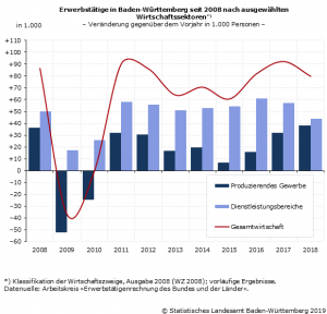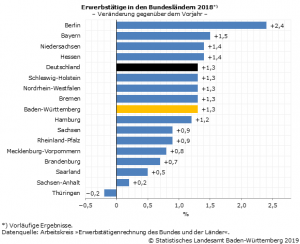 In Baden-Württemberg entsprach die Zuwachsrate der Zahl der Erwerbstätigen im Vergleich zum Vorjahr mit 1,3 % dem Bundesdurchschnitt. Die mit Abstand höchste Zunahme der Erwerbstätigkeit konnte mit einem Plus von 2,4 % in Berlin erzielt werden. Auch Bayern (1,5 %) sowie Niedersachsen und Hessen (jeweils 1,4 %) wiesen eine überdurchschnittliche Entwicklung auf. Thüringen war 2018 das einzige Bundesland mit einem Rückgang der Erwerbstätigenzahl (-0,2 %).