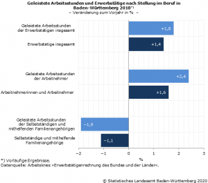Im Jahr 2018 belief sich das Arbeitsvolumen je Erwerbstätigen in Baden-Württemberg auf 1 392 Stunden. Die durchschnittliche Arbeitszeit fiel 2018 somit um sechs Stunden bzw. 0,5 % höher aus als im Vorjahr. Allerdings gab es 2018 einen Arbeitstag mehr als im Jahr 2017 (2018: 249 potenzielle Arbeitstage). Der Zuwachs des Arbeitsvolumens wurde u.a. durch die abnehmende Anzahl an Selbstständigen (−1,1 % gegenüber 2017), die sich durch eine hohe Pro-Kopf-Arbeitszeit auszeichnen, aber auch durch eine leicht zunehmende Teilzeitquote bei sozialversicherungspflichtig Beschäftigten, gedämpft.