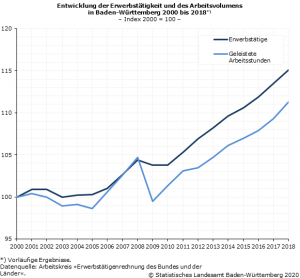Bei Betrachtung der Entwicklung der Erwerbstätigkeit und des Arbeitsvolumens ab dem Jahr 2000 zeigt sich, dass das Arbeitsvolumen zunächst bei steigender Erwerbstätigenzahl abnahm, im Jahr 2008 allerdings die Zunahme der Erwerbstätigkeit übertraf. Im Finanz- und Wirtschaftskrisenjahr 2009 nahm das Arbeitsvolumen dann jedoch deutlich kräftiger ab als die Erwerbstätigenzahl, was zu einem großen Teil auf den verstärkten Einsatz von Kurzarbeit zurückzuführen sein dürfte. Für den Zeitraum 2012 bis 2018 konnte eine beinahe identische Entwicklung der Erwerbstätigkeit und des Arbeitsvolumens festgestellt werden. Über den gesamten Zeitraum 2000 bis 2018 hinweg, erhöhte sich die Zahl der Erwerbstätigen um rund 15 %, das Arbeitsvolumen um rund 11 %. Dementsprechend sank die jährliche Arbeitszeit je Erwerbstätigen von 1 439 Stunden im Jahr 2000 auf 1 392 Stunden im Jahr 2018.