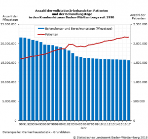 (zg) Rund 2,16 Millionen (Mill.) Patienten wurden 2017 in baden-württembergischen Krankenhäusern vollstationär versorgt. Dies waren 5 500 oder 0,3 % weniger als 2016. Damit sind nach Angaben des Statistischen Landesamtes die Patientenzahlen in der stationären Versorgung erstmals seit 11 Jahren nicht weiter angestiegen. Die durchschnittliche Verweildauer je Patientin oder Patient im Krankenhaus blieb 2017 mit 7,3 Tagen gegenüber dem Vorjahr konstant. Die Zahl der insgesamt angefallenen Behandlungstage sank um gut 152 000 auf 15,67 Mill.