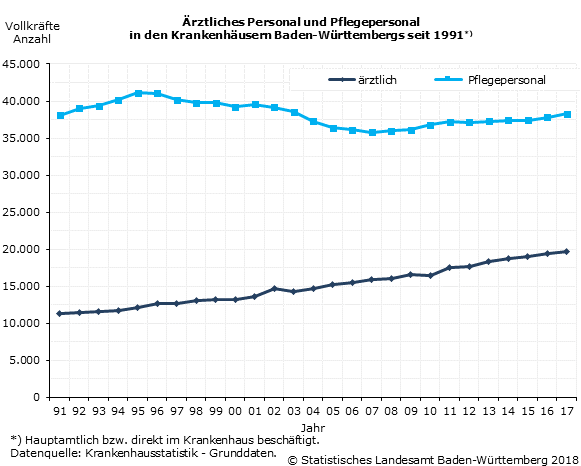 Die Zahl der an den Kliniken des Landes hauptamtlich beschäftigten Ärztinnen und Ärzte stieg, umgerechnet auf Vollkräfte, gegenüber dem Vorjahr um 1,5 % auf 19 681. Damit hielt der schon in den vergangenen Jahren zu beobachtende Anstieg beim ärztlichen Personal an. Die Kapazitäten beim Pflegepersonal in Krankenhäusern zeigten in den letzten Jahren geringere Zuwachsraten. Mit 38 294 direkt beschäftigten Pflegekräften (umgerechnet auf Vollkräfte) lag der Personalbestand 2017 um 1,3 % höher als im Vorjahr.