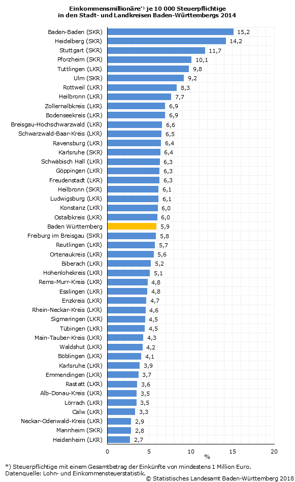 Auf Landesebene stieg ebenfalls die »Millionärsdichte« von 5,5 auf 5,9 Einkommensmillionäre je 10 000 Steuerpflichtige. Auf Kreisebene entwickelten sich die Zahlen im Vergleich zum Vorjahr jedoch sehr unterschiedlich: In Baden-Baden sank die Millionärsdichte von 18,7 auf 15,2, sodass sich der Vorsprung zum Stadtkreis Heidelberg (14,2) stark verringerte. Dies ist auf eine sinkende Anzahl von Einkommensmillionären im Stadtkreis Baden-Baden (-19 %) und einen Anstieg im Stadtkreis Heidelberg (+10 %) zurückzuführen.