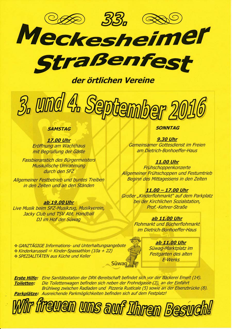 Das traditionelle Meckesheimer Straßenfest steht an, am 3. und 4. September 2016 wird wieder in der Bahnhofstraße gefeiert als einer der Höhepunkte in der Meckesheimer Festsaison.