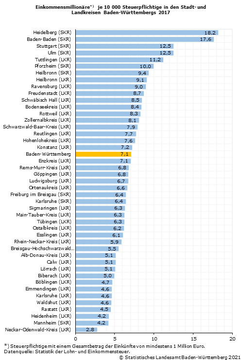 Auf Landesebene erhöhte sich die «Millionärsdichte” leicht von 6,8 auf 7,1 und liegt damit über dem bundesweiten Schnitt von rund 6 Einkommensmillionären je 10 000 Steuerpflichtige. Auf Kreisebene weist nun Heidelberg mit 18,2 (+31 %) die höchste Millionärsdichte auf und verdrängte Baden-Baden auf den zweiten Platz, welches nun auf 17,6 Einkommensmillionäre je 10 000 Steuerpflichtige kommt. Es folgen wie im Jahr 2016 Stuttgart und Ulm, die jeweils eine Millionärsdichte von 12,5 je 10 000 Steuerpflichtigen aufweisen.