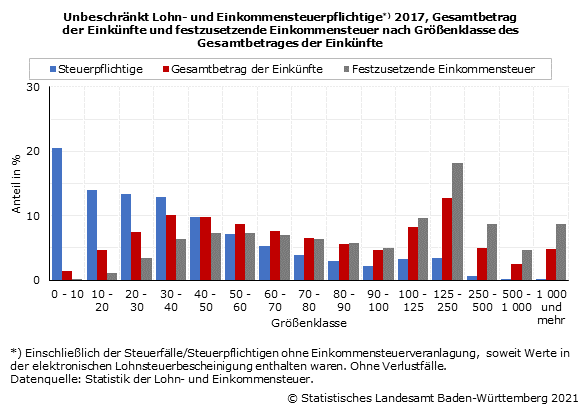 Insgesamt wurden im Jahr 2017 rund 5,8 Millionen (Mill.) unbeschränkt Steuerpflichtige2 in Baden-Württemberg erfasst. Deren Gesamtbetrag der Einkünfte summierte sich auf 256,4 Milliarden (Mrd.) Euro. Der durchschnittliche Gesamtbetrag der Einkünfte betrug 44 808 Euro, der Median lag bei 31 527 Euro.