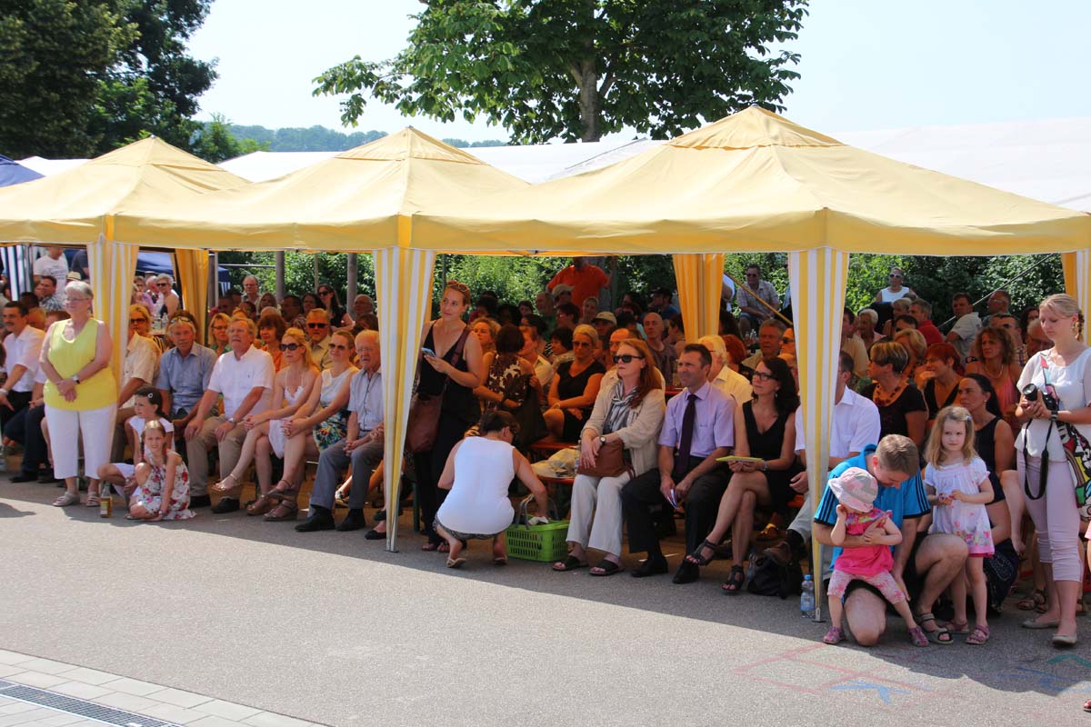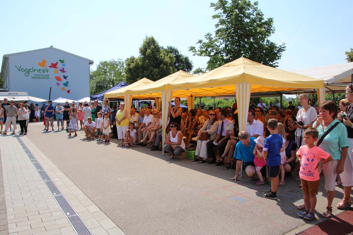 (zg) Bei strahlendem Sonnenschein konnte neben dem 50 – jährigen Schuljubiläum der Schule am Großen Wald nach einer 13 – monatigen Umbauzeit auch die Einweihung des städtischen Kindergartens „Vogelnest“ gefeiert werden. „Die Kombination aus Schule und Kindergarten ist ein wichtiger Schritt für die Sicherung des Schulstandortes Hoffenheim. Ich freue mich sehr, dass nach der Einweihung alle, sowohl Erzieherinnen, als auch Lehrkräfte und besonders die Kinder, künftig in einem vereinten Familienzentrum von einem übergreifenden und gemeinsamen Konzept profitieren und zusammenarbeiten können“, so Oberbürgermeister Jörg Albrecht. Durch die neue Sporthalle der Dietmar-Hopp-Stiftung und dem Pavillonbau von „Anpfiff ins Leben“ wird dieses Angebot optimal ergänzt. Oberbürgermeister Jörg Albrecht gab in seiner Ansprache einen informativen Abriss der letzten 50 Jahre Schulgeschichte. Er dankte dem Gemeinderat, dem Ortschaftsrat, dem Schulamt, den beteiligten städtischen Mitarbeitern, insbesondere dem Amt für Gebäudemanagement und dem Amt für Bildung, Familie und Soziales, dem Team um Kindergartenleiterin Sabine Kaltwasser und dem Team um Schulrektor Keil für ihre Unterstützung. „Der Weg war nicht immer einfach. Umso mehr freue ich mich heute, dass wir mit der Einweihung des Kindergartens nun einen großen Schritt in Richtung Familienzentrum machen und so den Grundstein für ein Mehrgenerationenprojekt legen“, so Ortsvorsteher Karl-Heinz Hess. Die Kindergarten- und Schulkinder umrahmten mit musikalischen Darbietungen diesen festlichen Anlass. Die Baumaßnahme wurde vom Amt für Gebäudemanagement unter Leitung des Dezernatsleiters Tobias Schutz eigenständig geplant. Die Gesamtkosten lagen dabei bei ca. 2 Millionen Euro. Neben dem Neu- bzw. Umbau der Kindergartenräumlichkeiten, wurden u.a. ein Aufzug angebaut, die Inklusionsräume für den Schulbetrieb realisiert, eine neue Außenanlage gebaut und Sanitär- und Heizanlagen saniert.