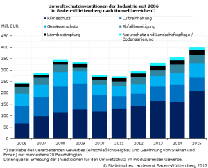 (zg) Die Industriebetriebe1 in Baden‑Württemberg haben im Jahr 2015 rund 400 Millionen (Mill.) Euro in Maßnahmen zum Schutz der Umwelt investiert. Wie das Statistische Landesamt mitteilt, wurde damit ein vorläufiger Höchstwert der letzten 10 Jahre erreicht. Im Verlgeich zum Vorjahr nahmen die Umweltschutzinvestitionen um fast 45 Mill. Euro (12,5 %) zu. Damit hat das Volumen der umweltschutzbezogenen Maßnahmen stärker zugenommen, als das der Gesamtinvestitionen (plus 7,9 %). Die Umweltschutzquote, das heißt der Anteil der Umweltschutzinvestitionen an den Gesamtinvestitionen der Industriebetriebe im Land, ist dadurch von 3,2 auf 3,4 % im Jahr 2015 gestiegen.