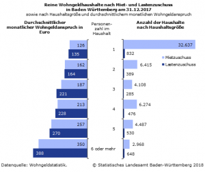Der durchschnittliche monatliche Wohngeldanspruch lag Ende 2017 insgesamt bei 170 Euro (Vorjahr: 175 Euro). Für Haushalte mit Mietzuschuss lag er bei 166 Euro (171 Euro) und für Haushalte mit Lastenzuschuss bei 235 Euro (247 Euro). Die durchschnittliche tatsächliche monatliche Miete betrug 491 Euro (480 Euro), die durchschnittliche berücksichtigungsfähige monatliche Miete lag bei 469 Euro (460 Euro) und das durchschnittliche Gesamteinkommen lag bei 983 Euro (950 Euro).