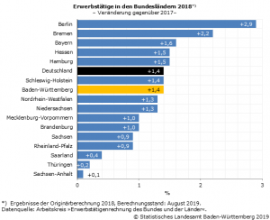 Erwerbstätigkeit lag 2018 um 1,4 % höher als 2017