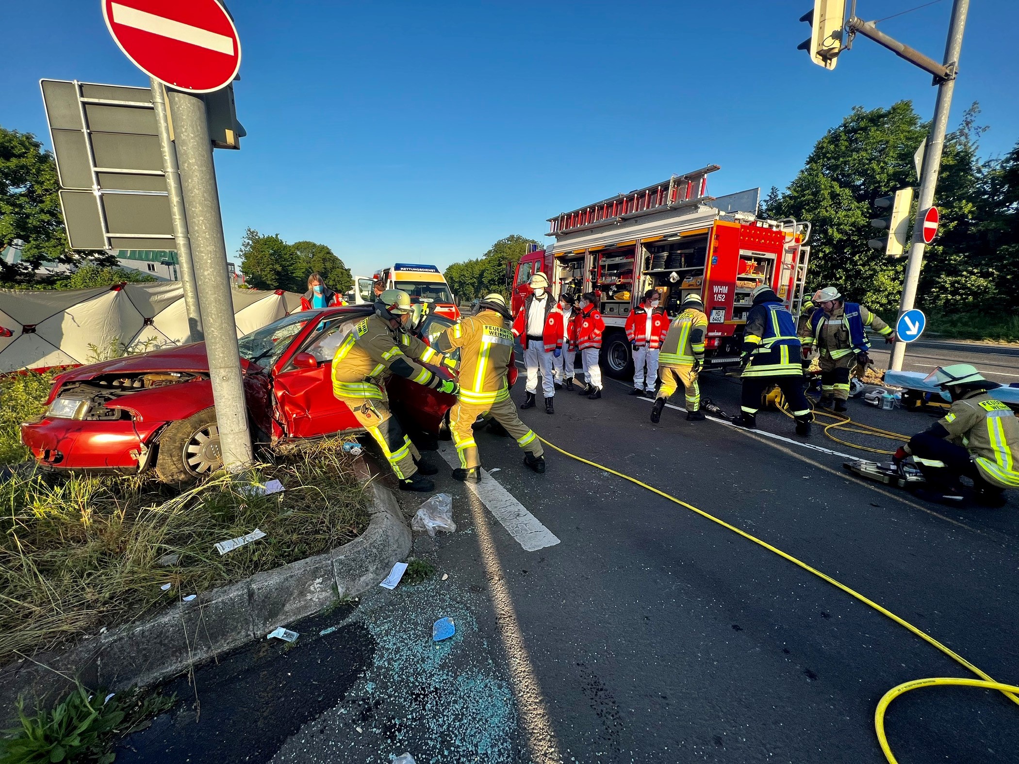 (Quelle: Freiwillige Feuerwehr Weinheim): Feuerwehrleute leisten Hilfe an einem Auto, welches auf einen Ampelmast prallte.