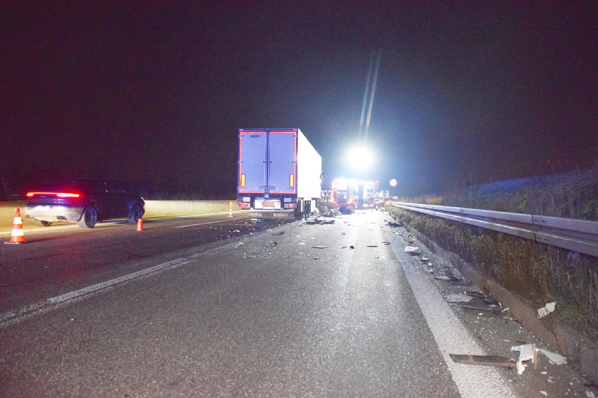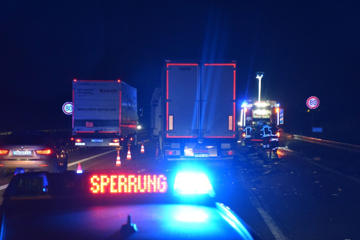 Gegen 20.10 Uhr krachte ein Sattelzug am Stauende in einem vorausfahrenden LKW. Das Fahrerhaus des auffahrenden Sattelzuges wurde komplett zerquetscht. Das Schadensbild ist sehr heftig.