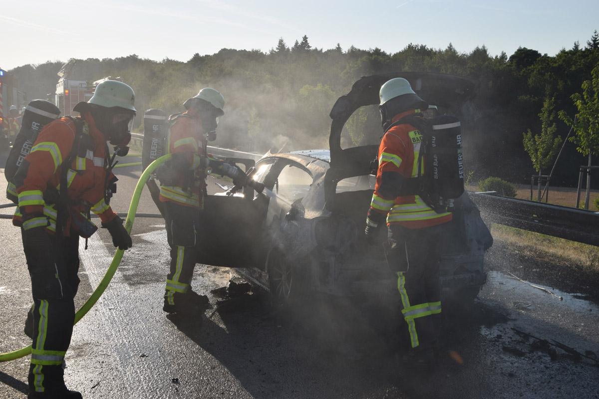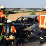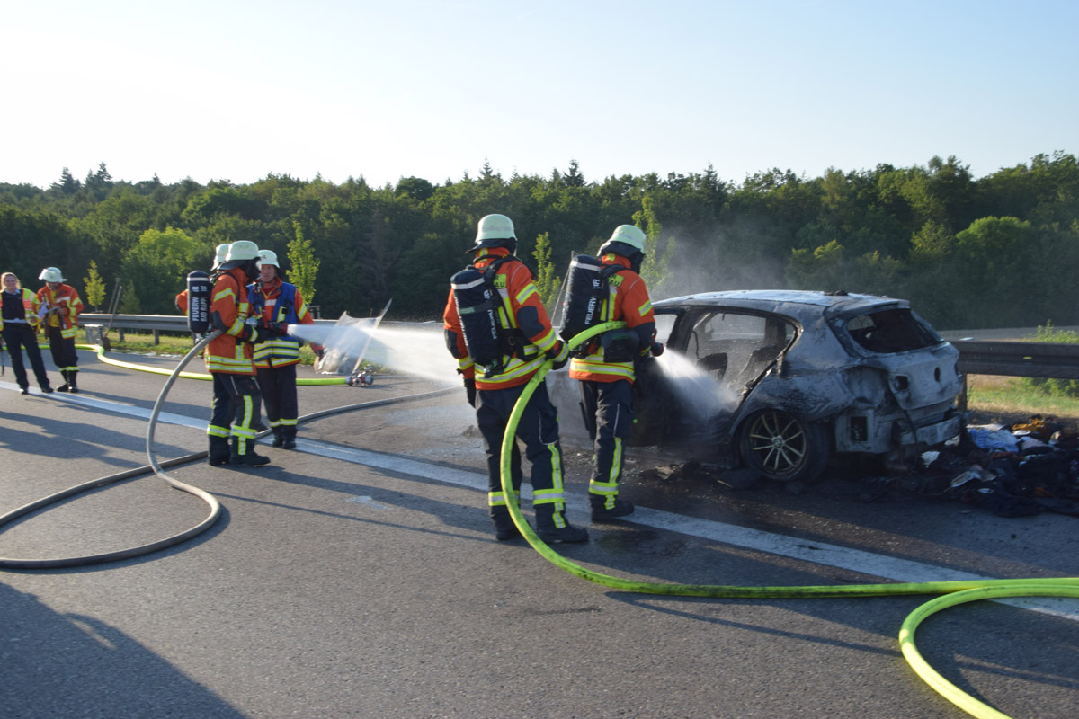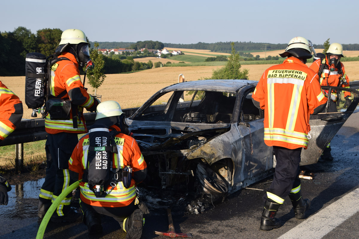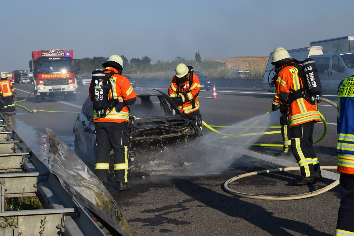 A6/Grombach. (jubu) „Ich habe sofort gesagt, dass wir rechts ranfahren und den Wagen verlassen sollen „, berichtet eine Mitfahrerin. Das rettete den Insassen letztlich das Leben, ihr Wagen brannte völlig aus. Drei junge Leute hatten am Mittwoch gegen 18.50 Uhr die Autobahn 6 zwischen den Anschlussstellen Bad Rappenau und Sinsheim-Steinsfurt in Richtung Mannheim befahren. „Auf einmal ging das Gaspedal nicht mehr und der Wagen wurde sehr heiß“, meint eine junge Frau aus dem Wagen. Eigentlich hätten sie nur unter die Motorhaube sehen wollen – ob etwas kaputt sei. „Da stieg schon der erste Rauch auf und ich habe gesagt raus raus“, so die Reisende. Der Fahrer steuerte auf den Standstreifen, rund einen Kilometer vor dem Rastplatz „Bauernwald“ – die Insassen verließen den Wagen und retteten sich in die Böschung neben der Autobahn. Floriansjünger aus Bad Rappenau waren an die Einsatzstelle geeilt – sie konnten sowohl den in Vollbrand stehenden BMW, als auch die brennende Böschung schnell löschen. 23 Einsatzkräfte der Abteilungen Bad Rappenau und Süd waren unter der Leitung des Kommandanten Felix Mann rund 30 Minuten im Einsatz. Während der Löscharbeiten waren der rechte und mittlere Fahrstreifen gesperrt. Es bildete sich ein Rückstau von rund zwei Kilometer Länge. Das Autobahnpolizeirevier Weinsberg hat die Ermittlungen aufgenommen.
