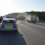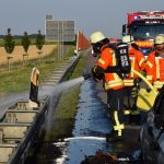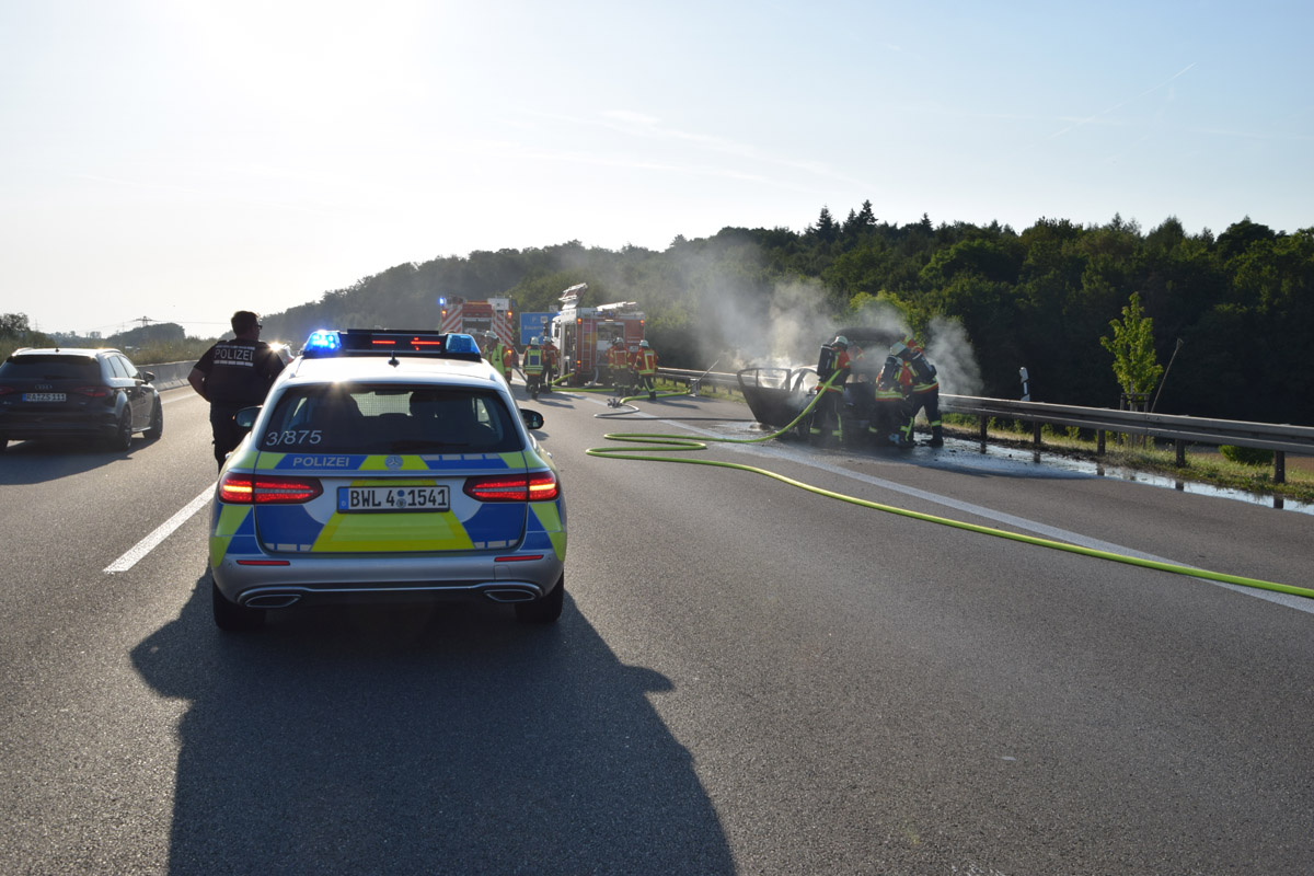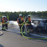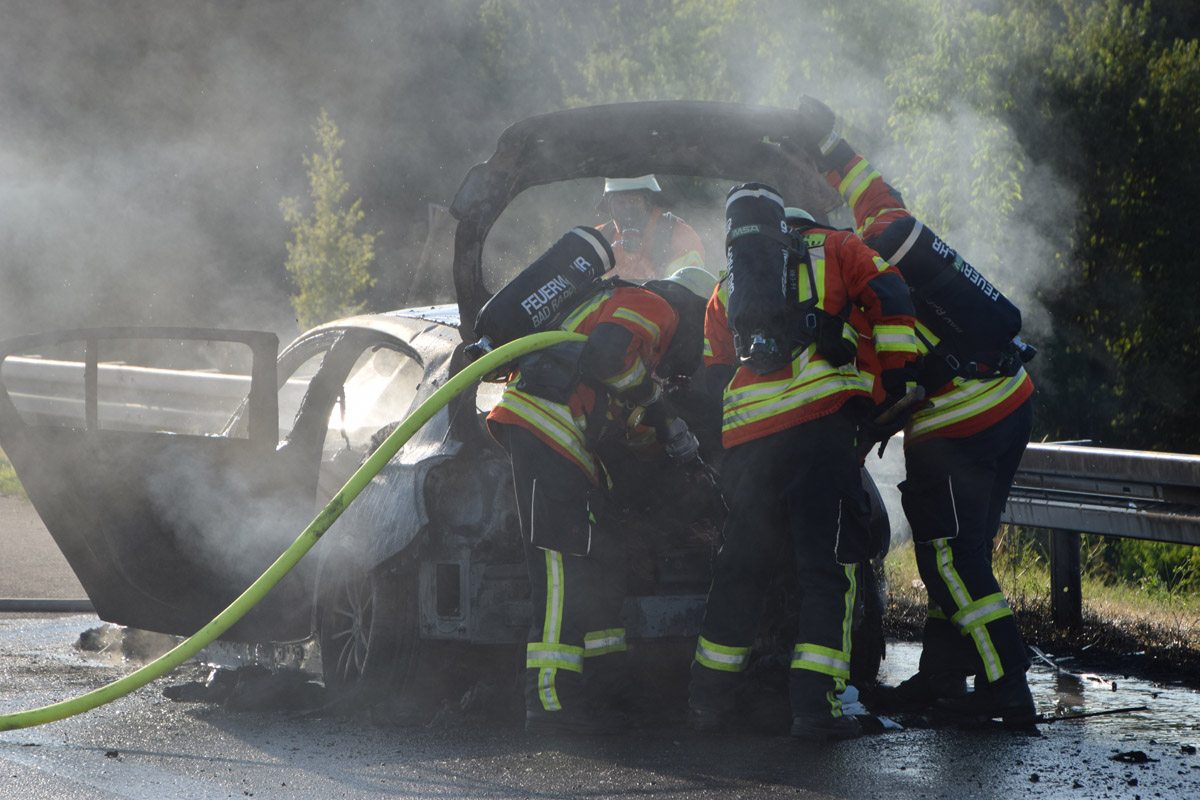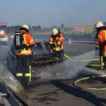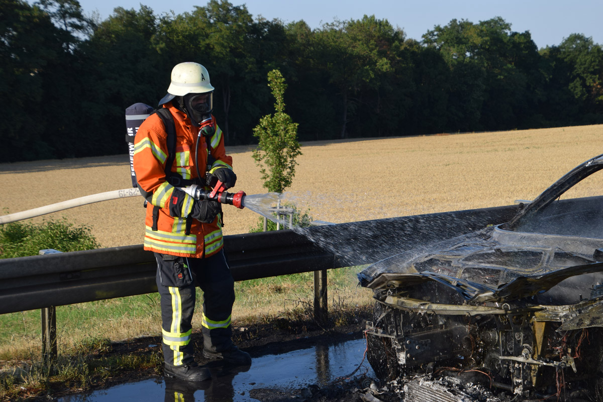 A6/Grombach. (jubu) „Ich habe sofort gesagt, dass wir rechts ranfahren und den Wagen verlassen sollen „, berichtet eine Mitfahrerin. Das rettete den Insassen letztlich das Leben, ihr Wagen brannte völlig aus. Drei junge Leute hatten am Mittwoch gegen 18.50 Uhr die Autobahn 6 zwischen den Anschlussstellen Bad Rappenau und Sinsheim-Steinsfurt in Richtung Mannheim befahren. „Auf einmal ging das Gaspedal nicht mehr und der Wagen wurde sehr heiß“, meint eine junge Frau aus dem Wagen. Eigentlich hätten sie nur unter die Motorhaube sehen wollen – ob etwas kaputt sei. „Da stieg schon der erste Rauch auf und ich habe gesagt raus raus“, so die Reisende. Der Fahrer steuerte auf den Standstreifen, rund einen Kilometer vor dem Rastplatz „Bauernwald“ – die Insassen verließen den Wagen und retteten sich in die Böschung neben der Autobahn. Floriansjünger aus Bad Rappenau waren an die Einsatzstelle geeilt – sie konnten sowohl den in Vollbrand stehenden BMW, als auch die brennende Böschung schnell löschen. 23 Einsatzkräfte der Abteilungen Bad Rappenau und Süd waren unter der Leitung des Kommandanten Felix Mann rund 30 Minuten im Einsatz. Während der Löscharbeiten waren der rechte und mittlere Fahrstreifen gesperrt. Es bildete sich ein Rückstau von rund zwei Kilometer Länge. Das Autobahnpolizeirevier Weinsberg hat die Ermittlungen aufgenommen.