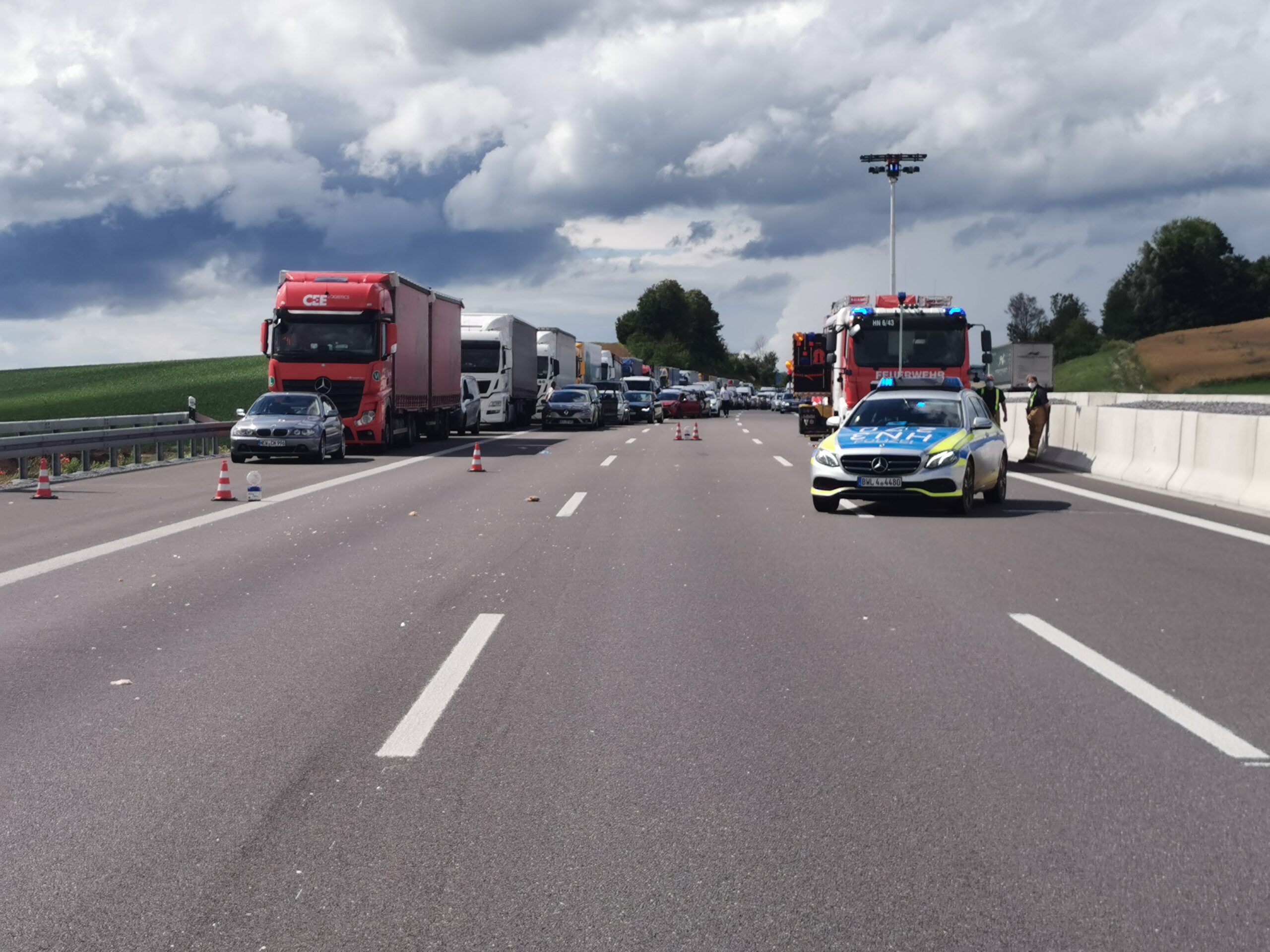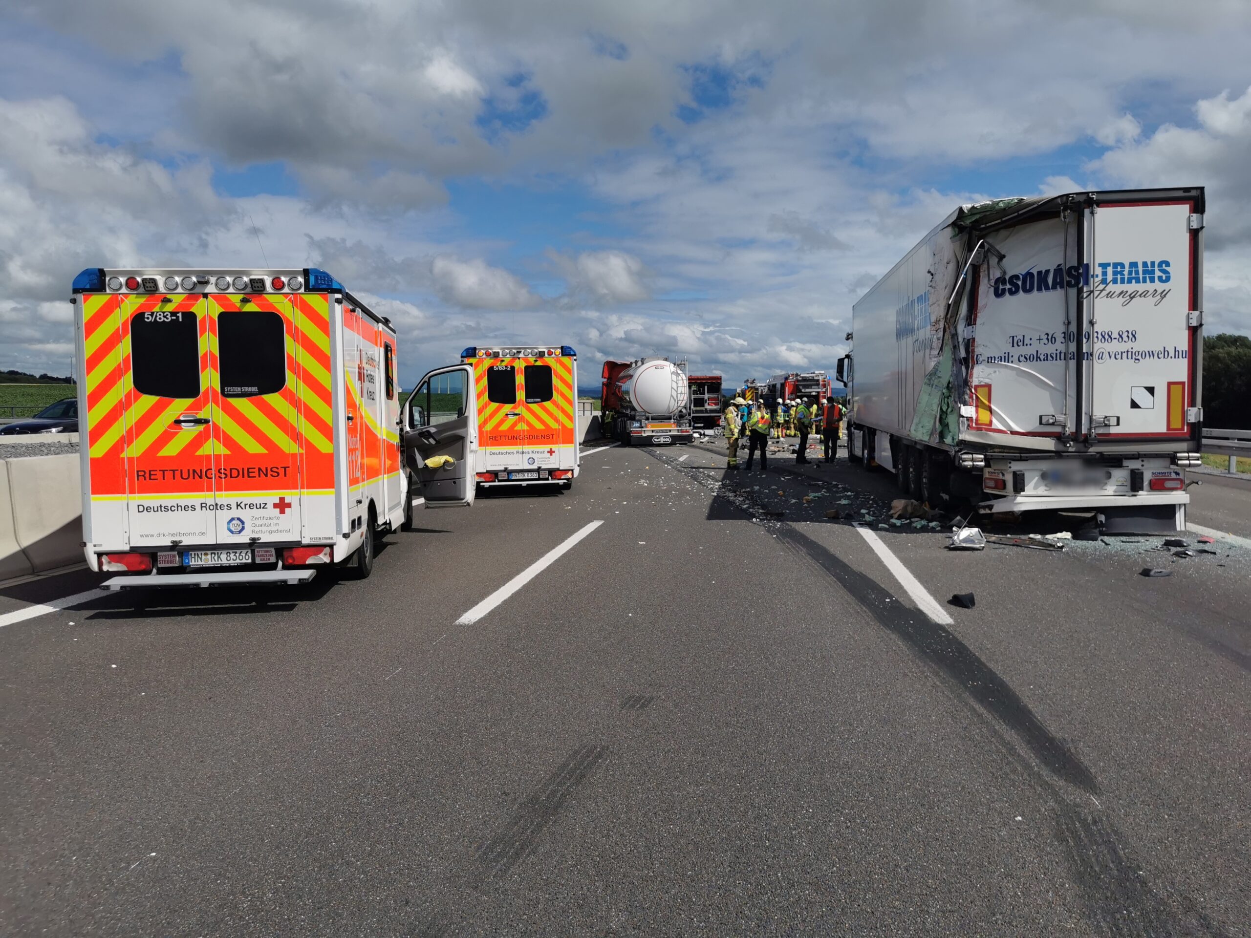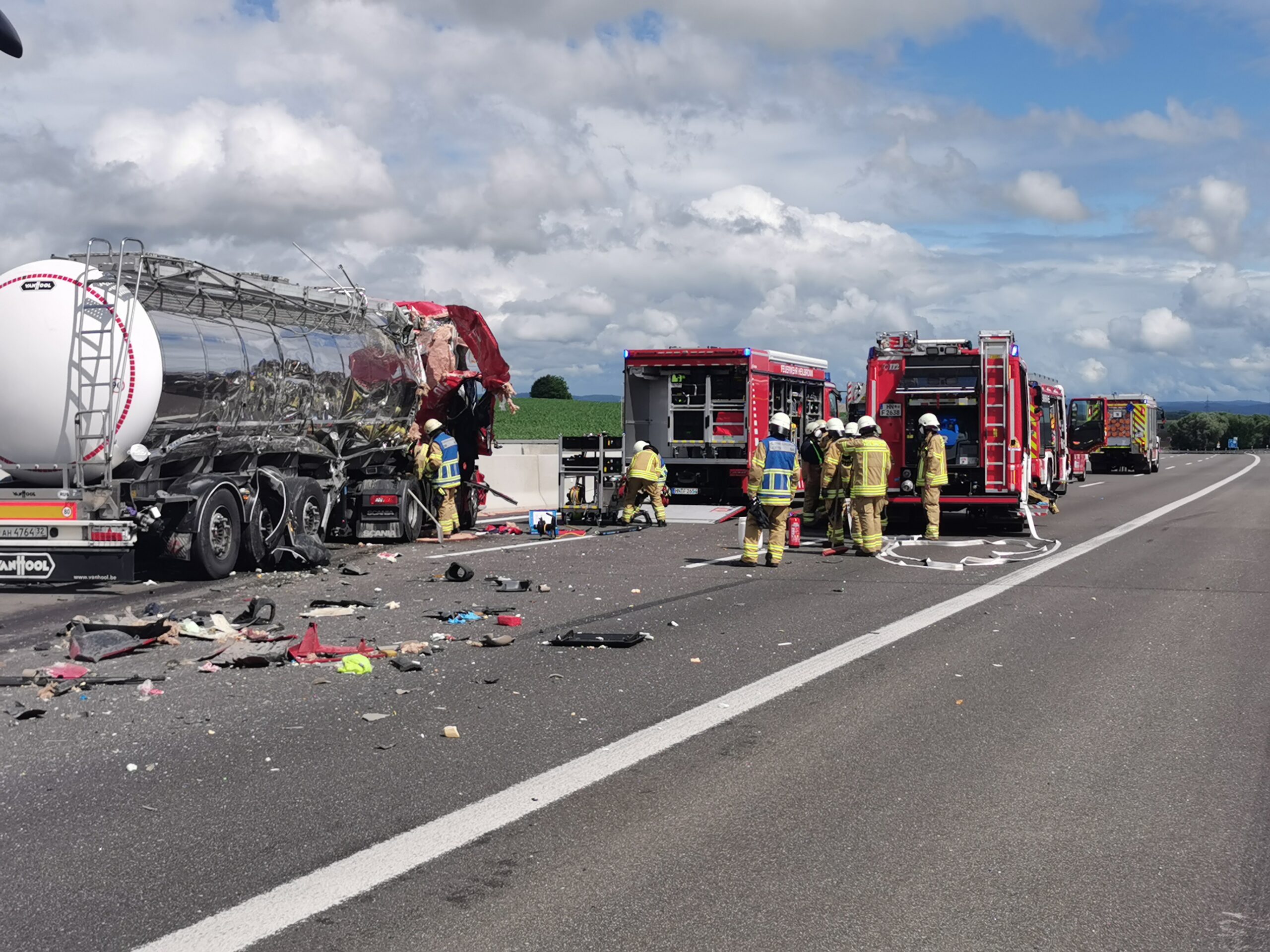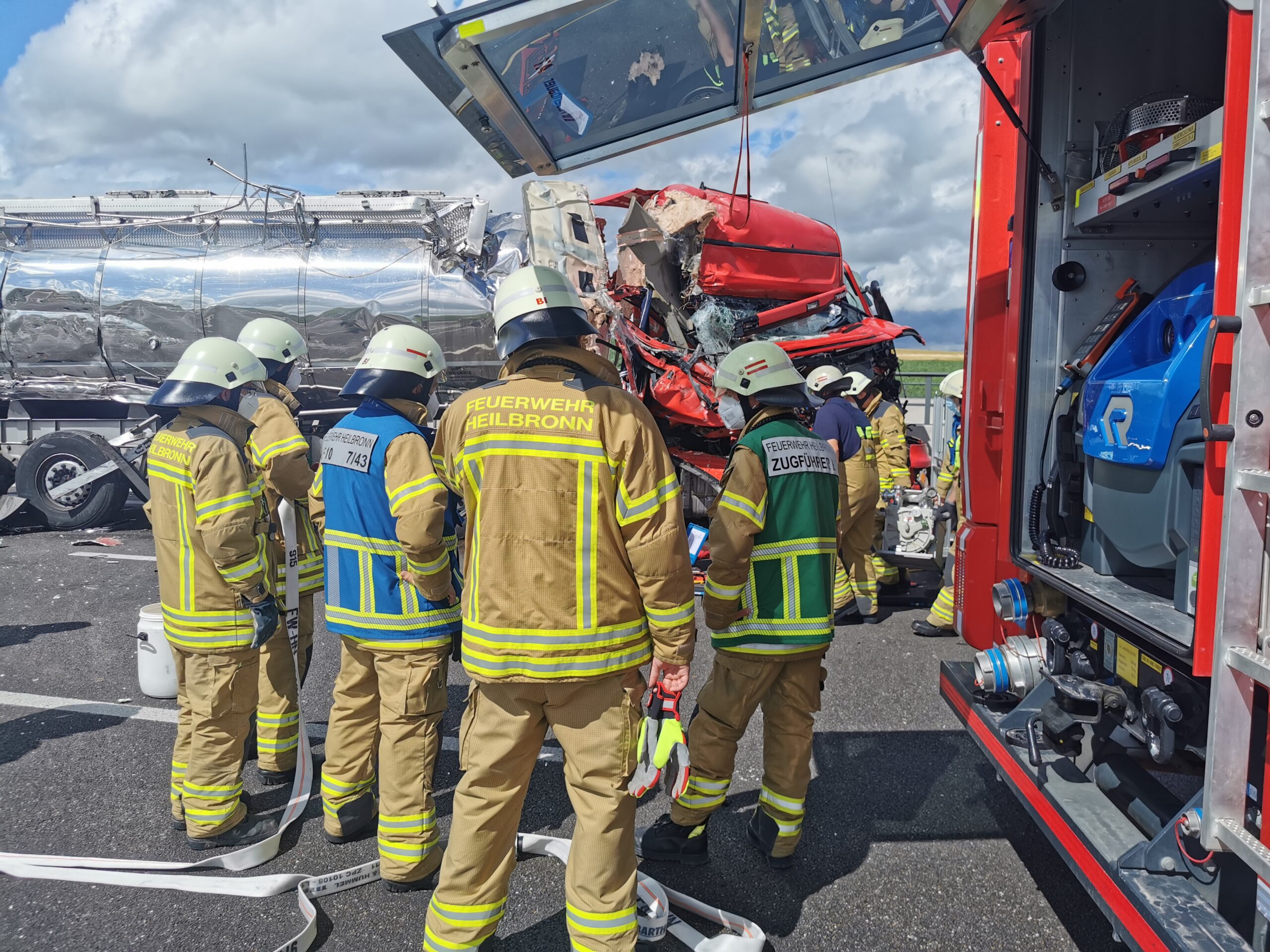 Da der Tankzug eine chemische Substanz der BASF geladen hat und geringe Mengen davon derzeit austreten, wurde zur Unterstützung der Berufsfeuerwehr Heilbronn die Werkfeuerwehr der BASF aus Ludwigshafen angefordert. Die Maßnahmen werden noch längere Zeit andauern. Die A6 in Richtung Heilbronn ist deshalb komplett gesperrt.