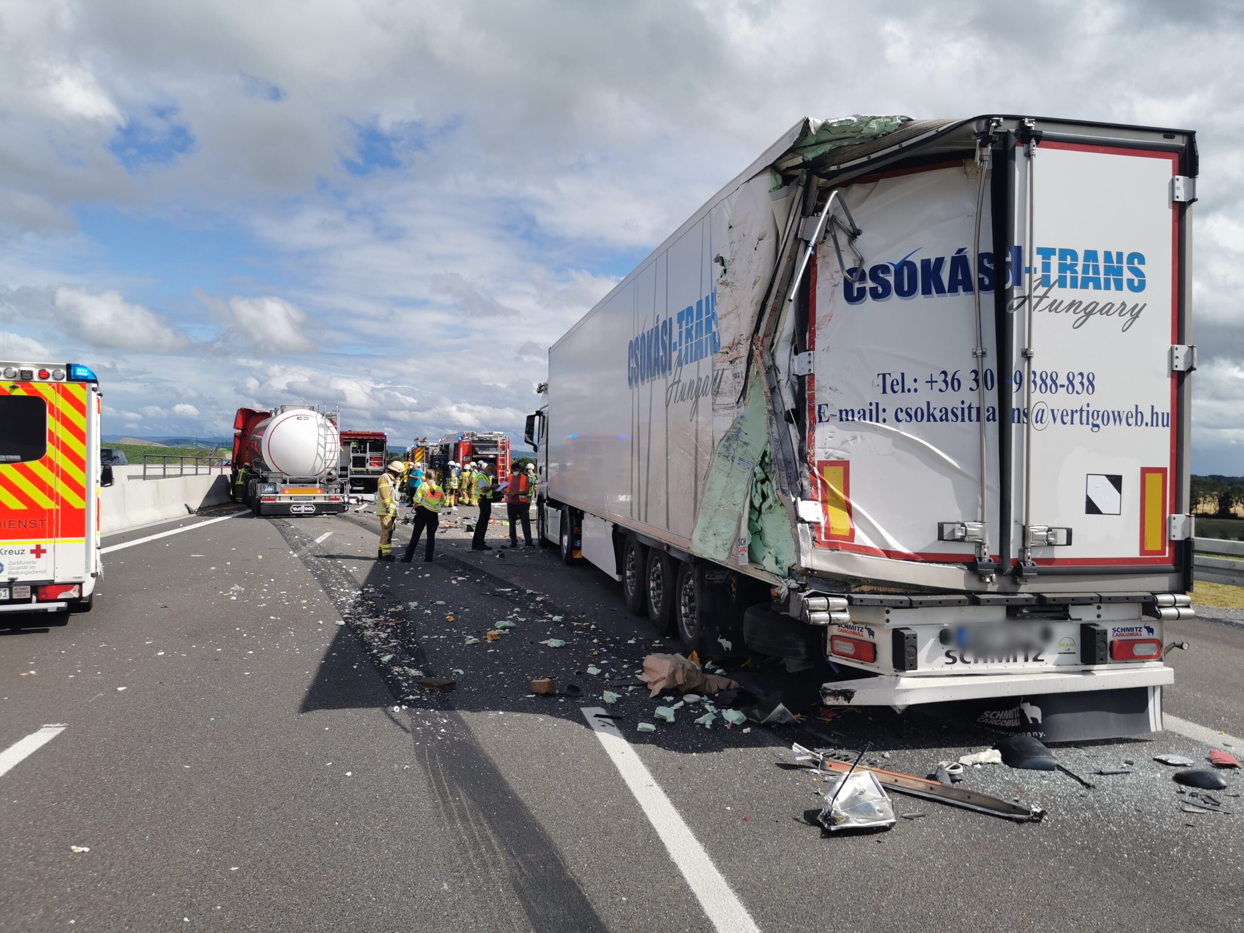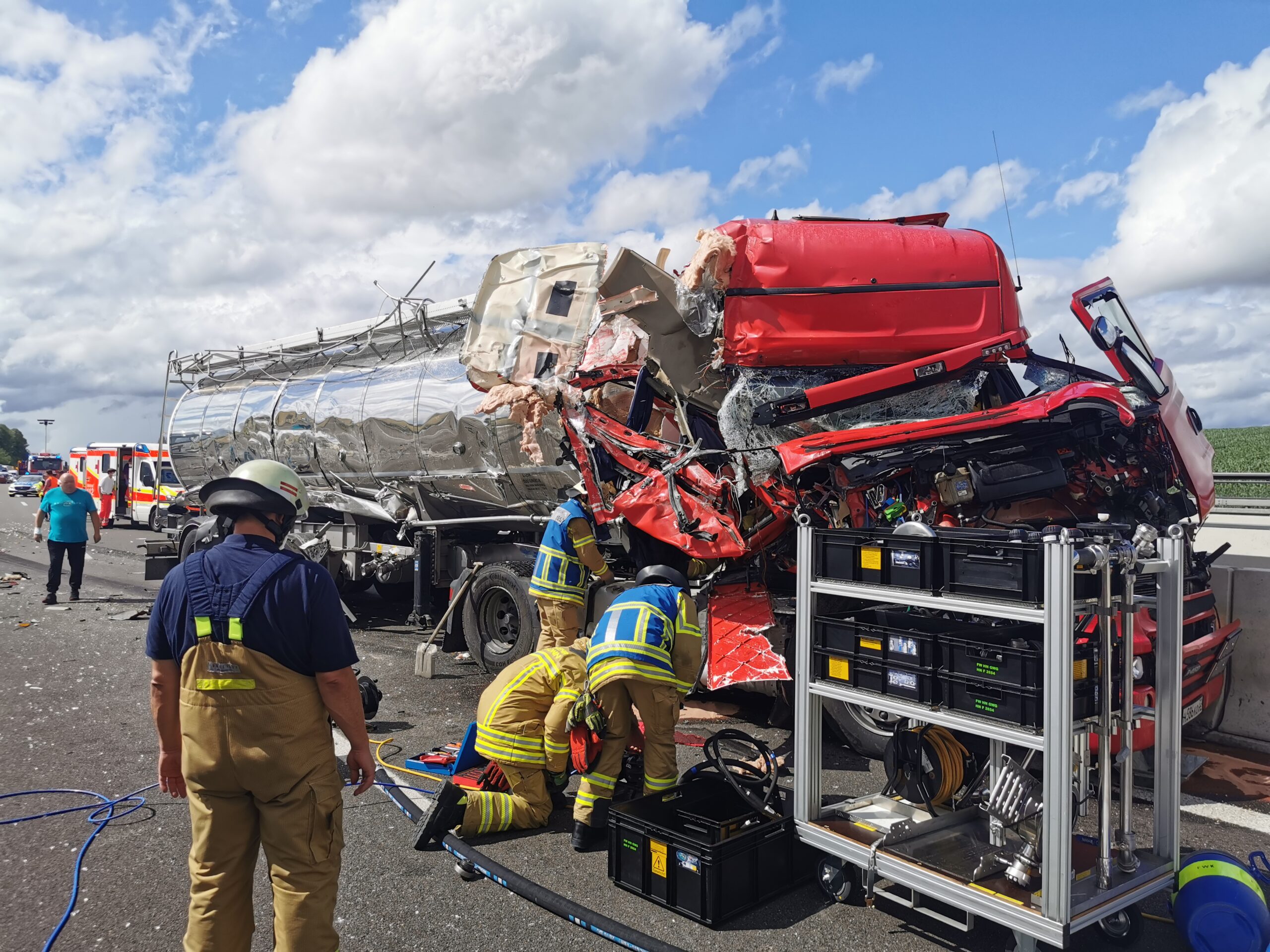 Der unfallverursachende Lastwagenfahrer konnte sich nahezu unverletzt aus seinem Fahrerhaus befreien und wurde den ersten Angaben nach nur leicht verletzt.