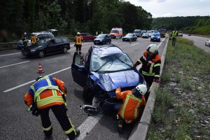 Steinsfurt. (red) Verletzt wurde ein Autofahrer aus Hessen bei einem Unfall am Sonntagnachmittag auf der Autobahn 6 bei Steinsfurt. Der Mann hatte mit seinem Ford Focus die Autobahn von Sinsheim nach Bad Rappenau, in Fahrtrichtung Heilbronn befahren. Aufgrund eines technischen Defekts ging sein Wagen während der Fahrt aus, teilte ein Polizeisprecher auf Nachfrage mit. Ein hinter ihm fahrender Peugeot-Fahrer erkannte die Situation zu spät und touchierte den Ford woraufhin dieser noch auf einen vor ihm fahrenden Kia Stonic geschoben wurde. Der Ford schleuderte mit dem Dach gegen die Betongleitwand ehe er wieder demoliert auf den Rädern zum Stillstand kam. Nach Auskunft des Notarztes wurde der Mann hinterm Steuer schwer verletzt und musste im Sinsheimer Krankenhaus stationär aufgenommen werden. Die übrigen Unfallbeteiligten blieben unverletzt. Während der Unfallaufnahme musste die Autobahn kurzzeitig voll gesperrt werden. Anschließend konnte der Verkehr über den mittleren Fahrstreifen an der Unfallstelle vorbeifließen. Schnell bildete sich hier der Unfallstelle ein Stau von rund fünf Kilometern Länge. Die Feuerwehr Sinsheim war an die Einsatzstelle geeilt, sicherte die Unfallstelle ab und klemmte die Fahrzeugbatterien der verunfallten Autos ab. Das Autobahnpolizeirevier Weinsberg hat die Ermittlungen aufgenommen. Über die Höhe des entstandenen Sachschadens konnte die Polizei zunächst keine Angaben machen.