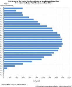 Am 25. April 2017 beginnen an den allgemeinbildenden Gymnasien die Abiturprüfungen. Rund 34 100 Schülerinnen und Schüler der Jahrgangsstufe 2 werden die schriftlichen Prüfungsfragen in Deutsch, Mathematik, einer Fremdsprache und einem weiteren Kernfach zu beantworten versuchen. Im vergangenen Jahr 2016 legten rund 33 800 Schülerinnen und Schüler die Abiturprüfung an allgemeinbildenden Gymnasien in Baden‑Württemberg ab. Dies waren nach Angaben des Statistischen Landesamtes rund 400 (1,2 Prozent) weniger als bei den vorangegangenen Abiturprüfungen 2015. Wie auch bei der vorjährigen Abiturprüfung bestanden von allen Prüflingen 98,1 Prozent, wohingegen 1,9 Prozent die Mindestanforderung der Durchschnittsnote 4,0 nicht erreichten.