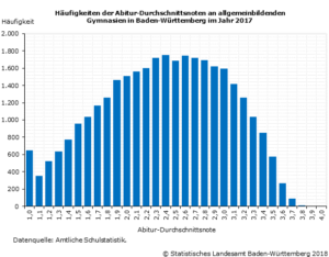 Am 18. April 2018 beginnen an den allgemeinbildenden Gymnasien die Abiturprüfungen. Rund 33 500 Schülerinnen und Schüler der Jahrgangsstufe 2 werden in den schriftlichen Prüfungsfragen in Deutsch, Mathematik, einer Fremdsprache und einem weiteren Kernfach ihr Wissen zeigen. Im vergangenen Jahr 2017 legten gut 33 200 Schülerinnen und Schüler die Abiturprüfung an allgemeinbildenden Gymnasien in Baden-Württemberg ab. Dies waren nach Angaben des Statistischen Landesamts knapp 600 (1,7 %) weniger als bei den vorangegangenen Abiturprüfungen 2016. Von allen Prüflingen bestanden 97,9 %, wohingegen 2,1 % die Mindestanforderung der Durchschnittsnote 4,0 nicht erreichten.