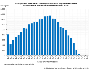 Am 4. Mai 2021 beginnen an den allgemeinbildenden Gymnasien die Abiturprüfungen. Knapp 28 600 Schülerinnen und Schüler werden in den schriftlichen Prüfungsfragen in Deutsch, Mathematik, einer Fremdsprache und einem weiteren Kernfach ihr Wissen zeigen. Im vergangenen Jahr 2020 legten gut 28 700 Schülerinnen und Schüler die Abiturprüfung an allgemeinbildenden Gymnasien in Baden-Württemberg ab. Dies waren nach Angaben des Statistischen Landesamts knapp 2 500 (8,0 %) weniger als bei den vorangegangenen Abiturprüfungen 2019. Von allen Prüflingen bestanden 98,6 %, wohingegen 1,4 % die Mindestanforderungen nicht erreichten.