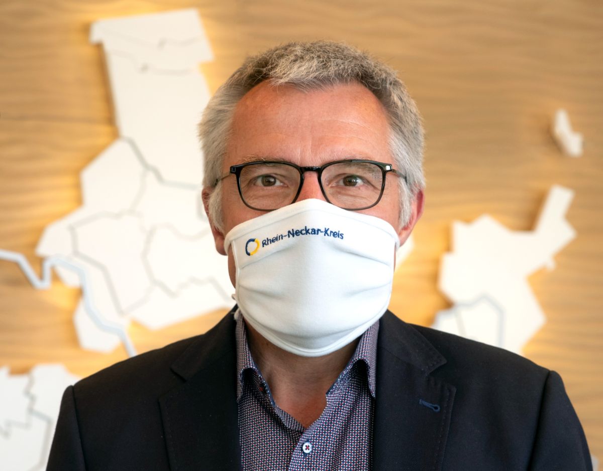 (Foto Landratsamt Rhein-Neckar-Kreis): Das Tragen einer Mund-Nasen-Bedeckung ist inzwischen selbstverständlich geworden: Auch Landrat Stefan Dallinger trägt Maske mit Rhein-Neckar-Kreis-Logo.