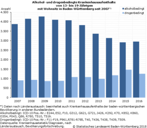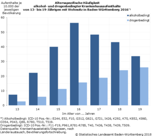 Die Häufigkeit, mit der Kinder und Jugendliche aus Baden-Württemberg aufgrund von Alkoholproblemen im Krankenhaus behandelt werden mussten, war bei den 16-Jährigen mit 56 Krankenhausbehandlungen je 10 000 der gleichaltrigen Bevölkerung am höchsten und ging in den folgenden Altersjahren wieder etwas zurück. Die Häufigkeit drogenbedingter stationärer Krankenhausaufenthalte zeigte dagegen vom 13. bis zum 19. Lebensjahr einen kontinuierlichen Anstieg. Sie lag für 19-Jährige bei 26 drogenbedingten Behandlungen je 10 000 der gleichaltrigen Bevölkerung.