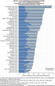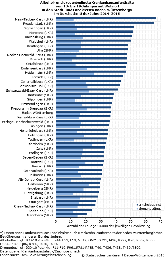 Zwischen den Stadt- und Landkreisen variierte die Häufigkeit, mit der die dort lebenden 13- bis 19-Jährigen aufgrund von Alkohol- oder Drogenproblemen stationär behandelt werden mussten, deutlich. Dabei wiesen Kreise mit überdurchschnittlicher Häufigkeit alkoholbedingter Behandlungen nicht zwangsläufig auch erhöhte Behandlungshäufigkeiten bei Drogen auf. So mussten beispielsweise im 3-Jahresdurchschnitt 2014-20161) aus dem Main-Tauber-Kreis mit 67 Behandlungsfällen und aus dem Landkreis Freudenstadt 66 Behandlungsfällen je 10 000 der gleichaltrigen Bevölkerung deutlich mehr Jugendliche alkoholbedingt in einem Krankenhaus stationär behandelt werden als im Landesdurchschnitt (37 Fälle je 10 000 der gleichaltrigen Bevölkerung). Die Häufigkeit drogenbedingter Krankenhausaufenthalte lag dagegen in diesen beiden Kreisen mit 12 bzw. 13 Fällen je 10 000 der gleichaltrigen Bevölkerung deutlich unter dem Landesdurchschnitt (16 Fälle je 10 000 der gleichaltrigen Bevölkerung).