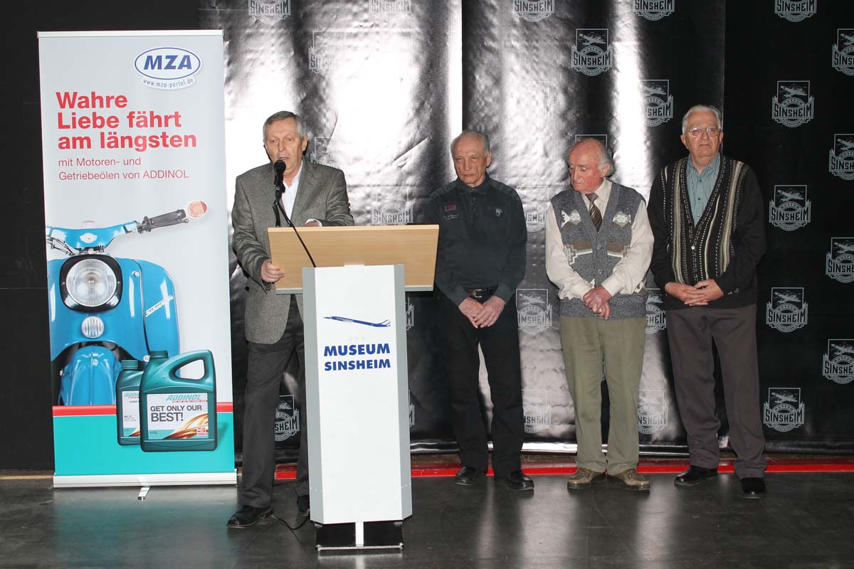 Der Oberbürgermeister von Suhl , die 4 Konstrukteure von damals , div. Ehrengäste , Besitzer und Museumsmitglieder waren geladen , hielten Reden und erzählten die Entstehungsgeschichte der Schwalbe und deren Siegeszug mit Ihren anderen motorisierten Vogelarten.