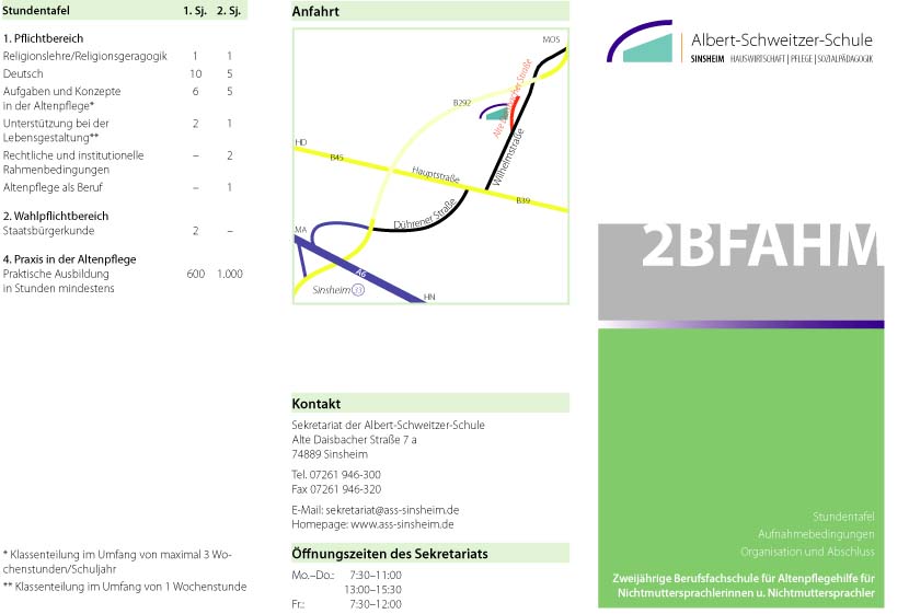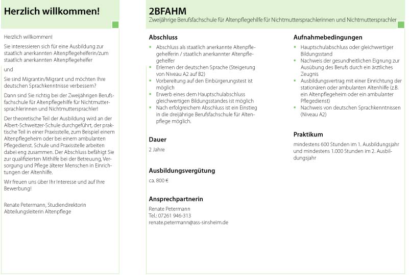 Aufnahmevoraussetzungen sind u.a. ein Nachweis über das Sprachniveau A2 (wir bieten an der Schule den Sprachtest nach dem 11.5.16 an) und einen Ausbildungsvertrag mit einer Praxisstelle (Pflegeheim). Weitere Informationen gibt es auf der Website unter www.ass-sinsheim.de