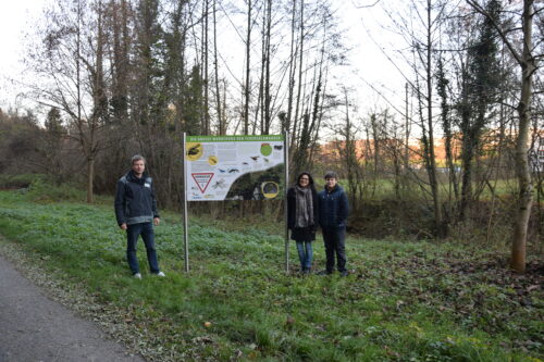 Bild (Stadt Sinsheim): Holger Brom (Amt für Stadt- und Flächenentwicklung), Angelika Huber (NABU) und Sohn Silas (v.l.n.r.) präsentieren das neue Schild, das in Reihen auf die Wanderung der Salamander aufmerksam macht