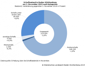 Die wichtigste Einzelkategorie ist die der Mutterschafe, auf die mit 148 100 Tieren rund 69 % aller Schafe entfielen. Im Vergleich zu 2018 ist die Zahl der Mutterschafe leicht zurückgegangen (−1,9 %). Während für den Bestand an Lämmern und Jungschafen im Vorjahreszeitraum noch ein Anstieg von über 10 % zu verzeichnen war, ist für den abgelaufenen Zeitraum eine Abnahme um 4,6 % festzustellen. Ihr Anteil am Gesamtbestand beläuft sich mit 58 500 Tieren auf rund 27 %. Die Erzeugung von Schafsmilch wird nur in wenigen Betrieben in Baden-Württemberg praktiziert. Sie halten zusammen rund 2 400 Milchschafe, die etwa 1 % am gesamten Schafbestand ausmachen.