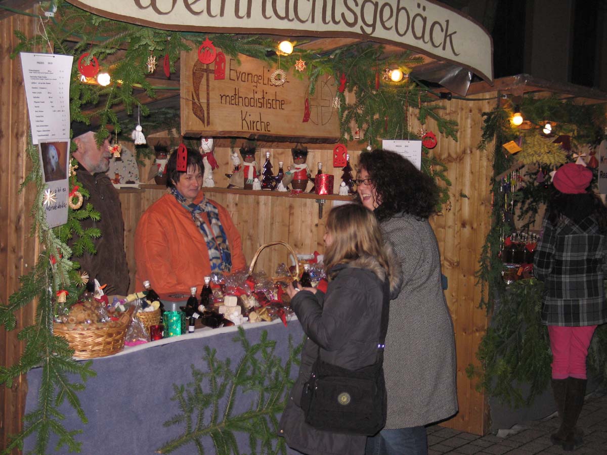 Sekt/ Lachs, Plätzchen/ Kaffee, Schupfnudel und Sauerkraut, Strickwaren, Adventskränze, Puppenkleider/ Strümpfe, Gestecke, Steak, Wurst-Glühwein, Fanta, Cola, Mineralwasser, Saure Bohnen im Glas, Odenwälder Kochkäse, Kuchen im Glas, Kalender