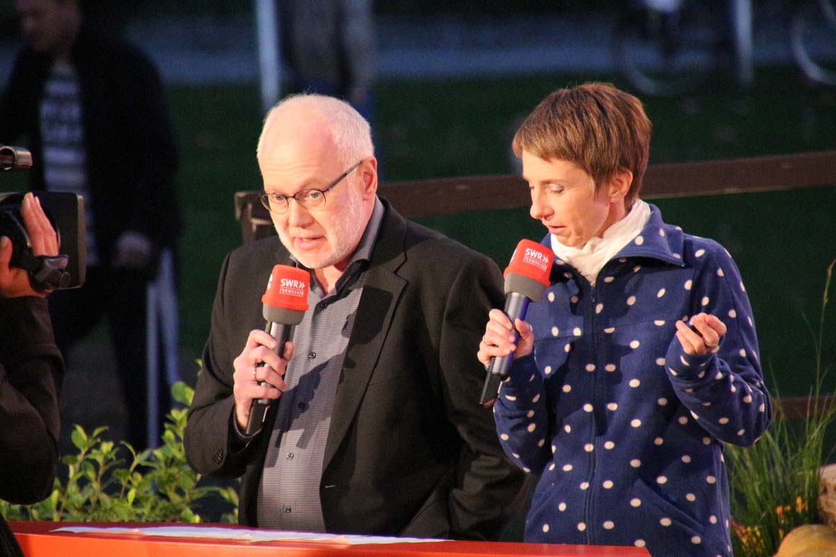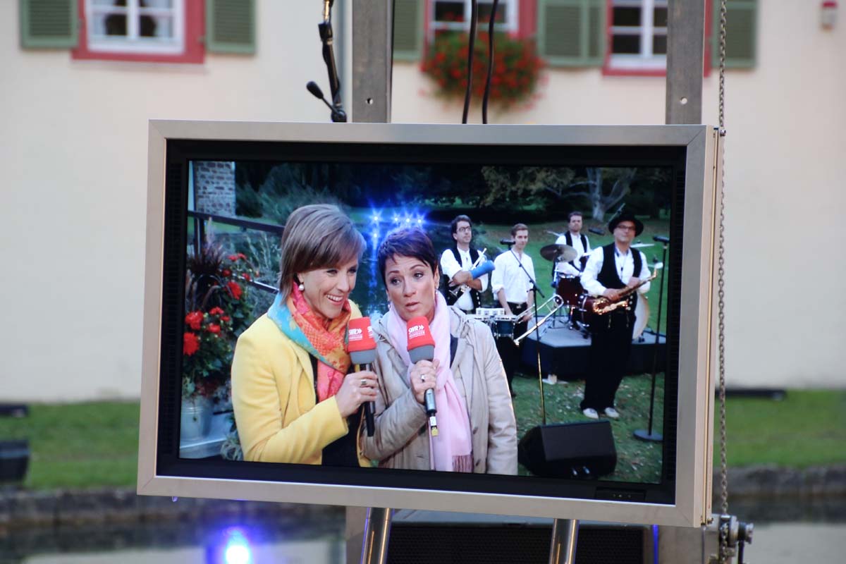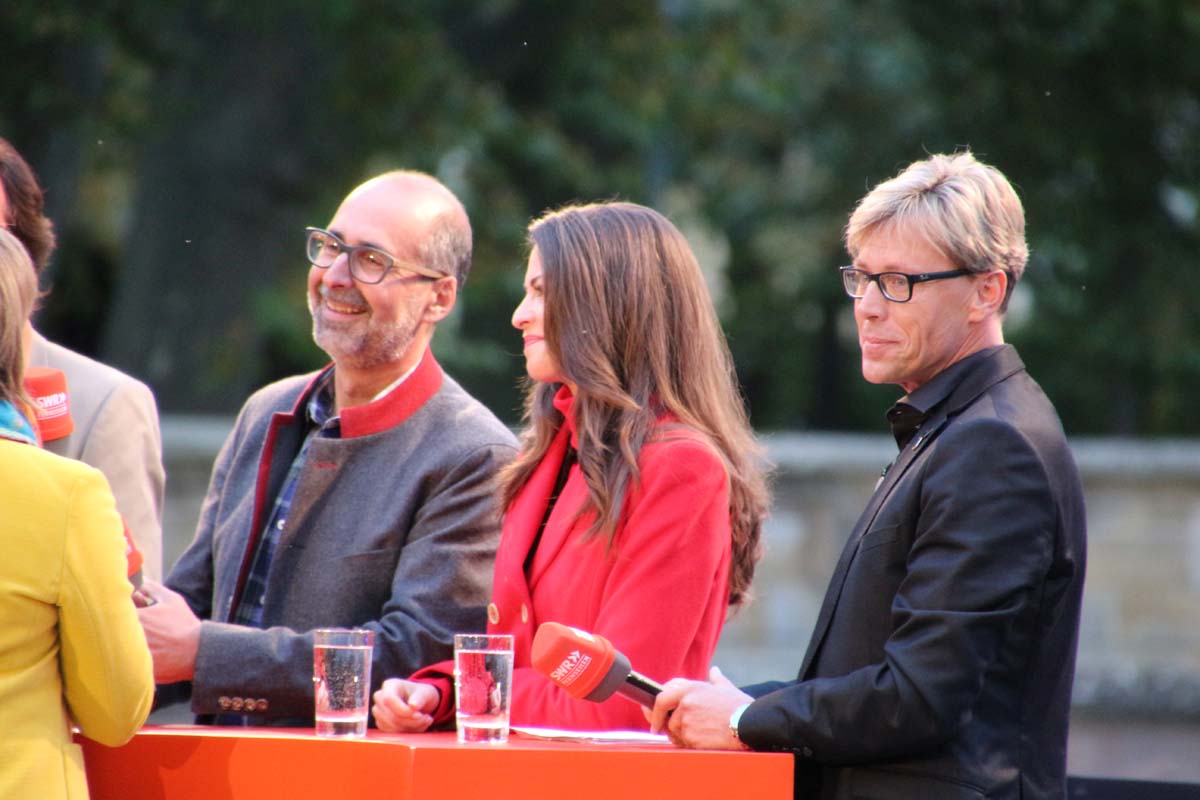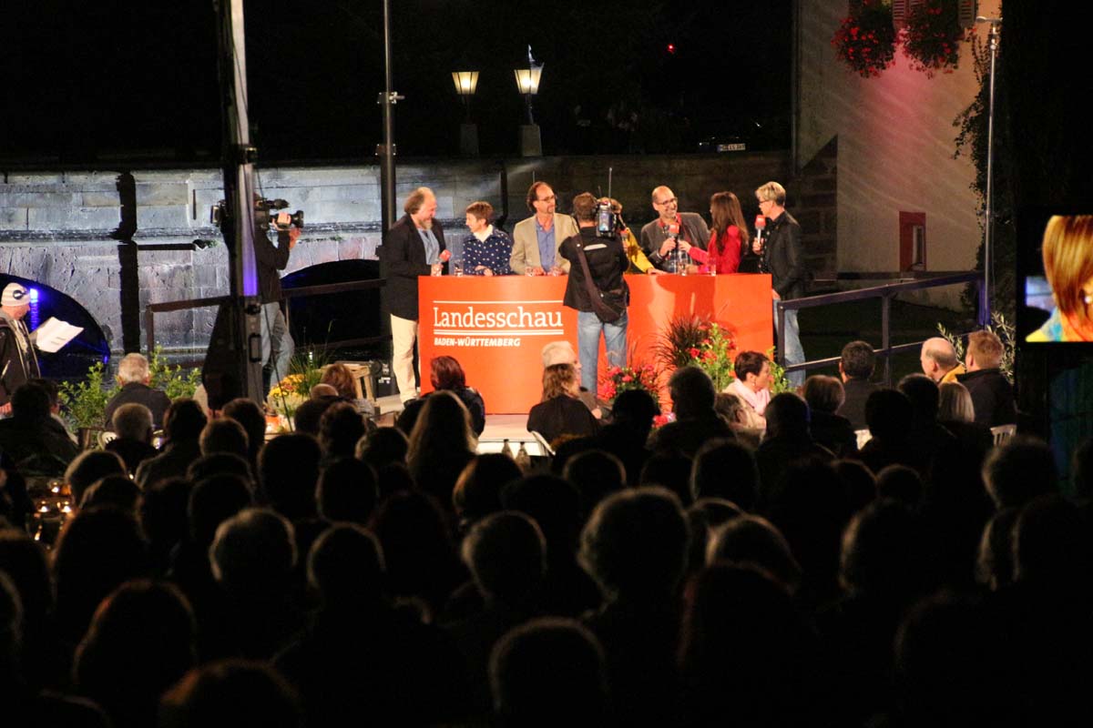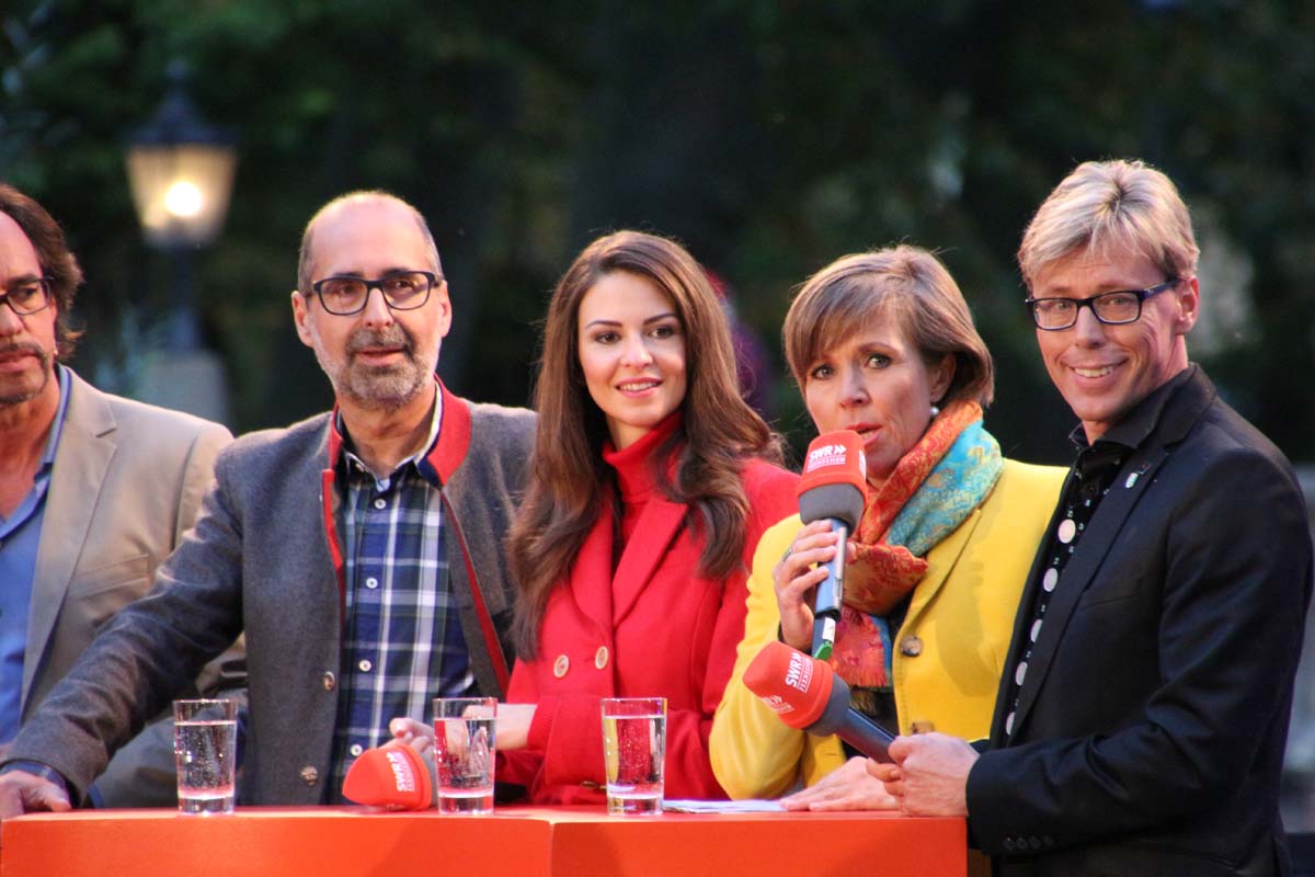(cr) Spätestens jetzt kennt jeder im Ländle Angelbachtal. An 4 Tagen gab es je eine Reportage über den so beliebten Ort im Kraichgau mit der „Landesschau Baden-Württemberg: Landesschau Mobil Angelbachtal“. Hier wurden alle Facetten des Lebens in Angelbachtal gezeigt. Für den 5. Tag war dann die Landesschau live vor Ort mit prominenten Gästen. Zur Einstimmung heizte der schwäbische Kabarettist Christoph Sonntag dem Publikum ein und pünktlich um 18.15 Uhr hiess es dann drei, zwei , eins – hie ist die Landesschau Baden Württemberg aus Angelbachtal. Bei bestem Vorzeigewetter war der Schlosspark gut gefüllt und alles klappte wie am Schnürchen. Fast alles, denn die Zuspielungen aus Stuttgart war auf den Monitoren leider nicht zu sehen. Trotz alledem war dies das Highlight in Angelbachtal. Beim Thema Heimat und Mundart glänzten dann die eingeladenen Gäste wie der Alemanne Hansy Vogt und der schwäbische Kabarettist Christoph Sonntag sowie Eberhard Reuss und Doris Steinbeiser. Musikalisch rockten „Luddi“ eine alemannische Mundart-Band.