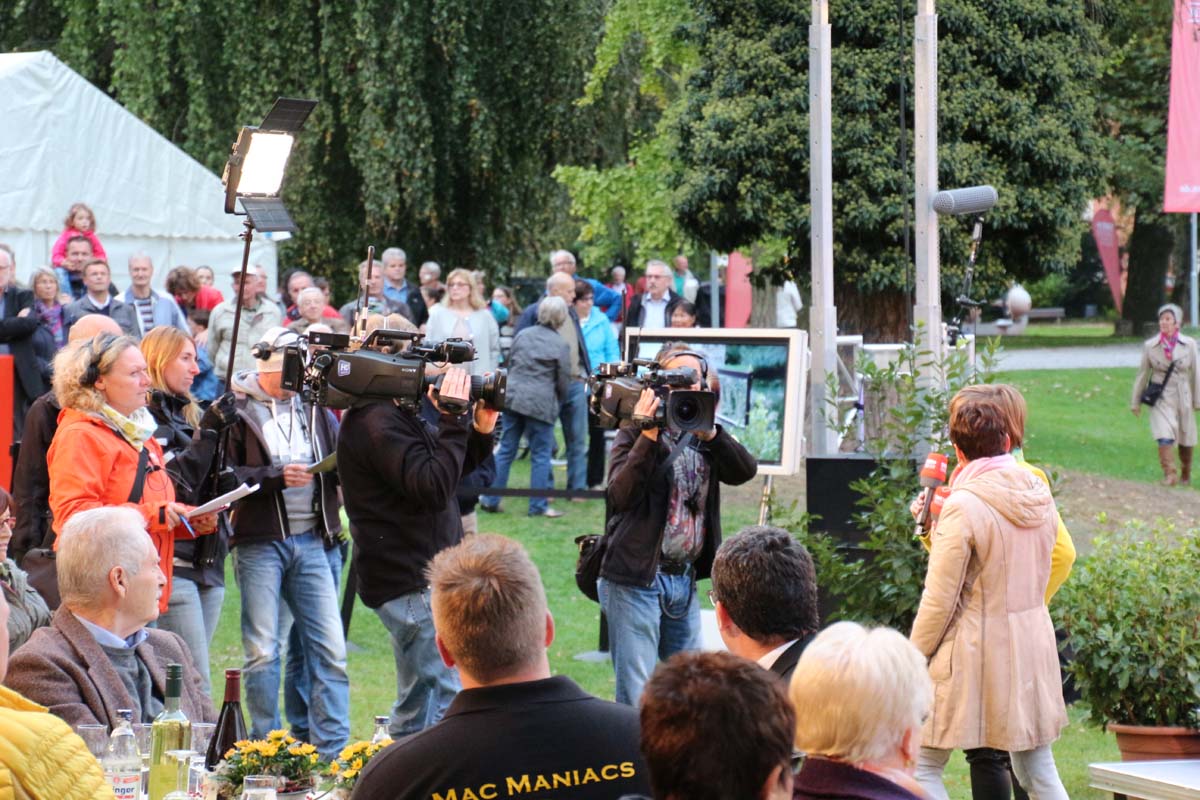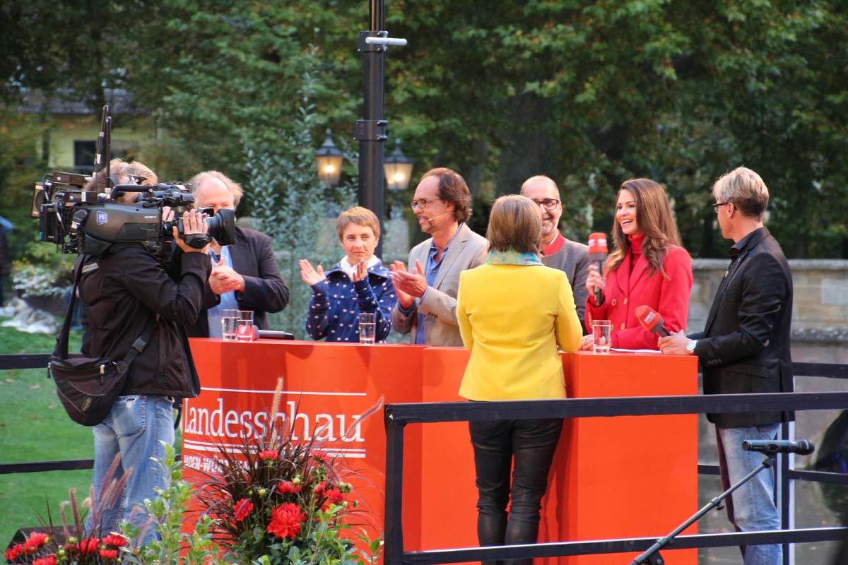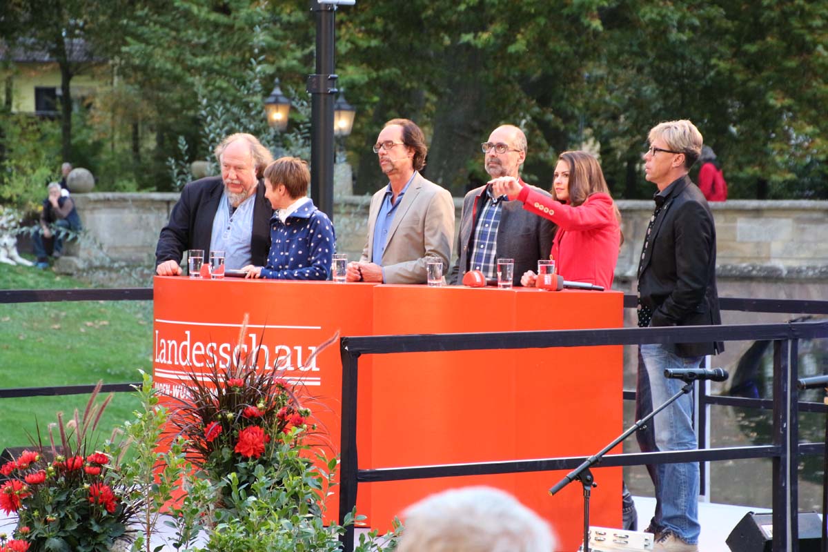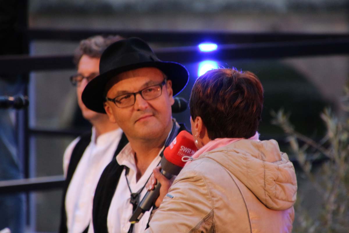 (cr) Spätestens jetzt kennt jeder im Ländle Angelbachtal. An 4 Tagen gab es je eine Reportage über den so beliebten Ort im Kraichgau mit der „Landesschau Baden-Württemberg: Landesschau Mobil Angelbachtal“. Hier wurden alle Facetten des Lebens in Angelbachtal gezeigt. Für den 5. Tag war dann die Landesschau live vor Ort mit prominenten Gästen. Zur Einstimmung heizte der schwäbische Kabarettist Christoph Sonntag dem Publikum ein und pünktlich um 18.15 Uhr hiess es dann drei, zwei , eins – hie ist die Landesschau Baden Württemberg aus Angelbachtal. Bei bestem Vorzeigewetter war der Schlosspark gut gefüllt und alles klappte wie am Schnürchen. Fast alles, denn die Zuspielungen aus Stuttgart war auf den Monitoren leider nicht zu sehen. Trotz alledem war dies das Highlight in Angelbachtal. Beim Thema Heimat und Mundart glänzten dann die eingeladenen Gäste wie der Alemanne Hansy Vogt und der schwäbische Kabarettist Christoph Sonntag sowie Eberhard Reuss und Doris Steinbeiser. Musikalisch rockten „Luddi“ eine alemannische Mundart-Band.