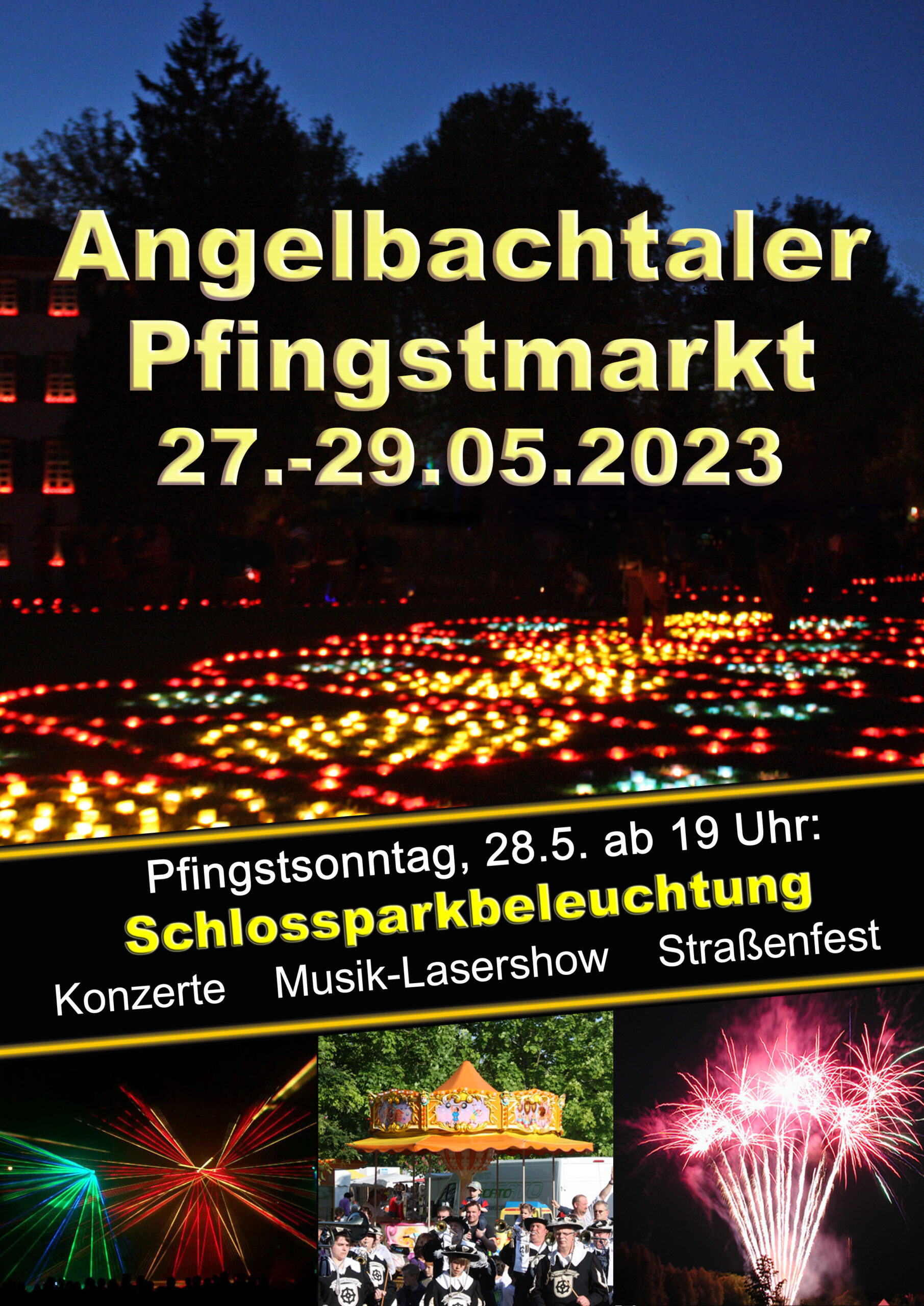 Der Angelbachtaler Pfingstmarkt ist weithin bekannt als Garant für eindrucksvolle Illuminationskunst, abwechslungsreiche Musik, spannende Ausstellungen, einen vielseitigen Krämermarkt und tolle Action bei diversen Fahrgeschäften. Viele Besucher freuen sich auf die einmalige Stimmung, den Spaß, die Gastfreundschaft und ausgiebige Schnäppchenjagd auf dem bunten Jahrmarkt.