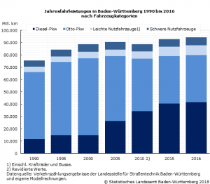 Nach aktuellen Berechnungen des Statistischen Landesamtes, wurden im Jahr 2016 mehr als 94 Milliarden (Mrd.) km mit Kraftfahrzeugen zurückgelegt. Dies sind rund 1,4 Mrd. km (1,5 %) mehr als 2015 und ca. 6,3 % mehr als im Jahr 2010. 85 % der Jahresfahrleistungen (ca. 80 Mrd. km) entfallen auf den Pkw-Verkehr, der 2016 um 1,3 % zunahm. Die Jahresfahrleistungen der schweren Nutzfahrzeuge sind gegenüber dem Vorjahr sogar um 2,0 % gestiegen. Ihr Anteil an den jährlichen Kilometerleistungen im Land beträgt knapp 6,8 %. Ein besonders starker Anstieg der Fahrleistungen ist bei den leichten Nutzfahrzeugen mit einem zulässigen Gesamtgewicht von kleiner als 3,5 Tonnen zu verzeichnen. Gegenüber 2015 nahm deren Fahrleistung um 4 % zu, gegenüber 2010 um 54 %. Insgesamt sind die Fahrleistungen des Güterverkehrs im Vergleich zu 2015 um ca. 3 % angestiegen.
