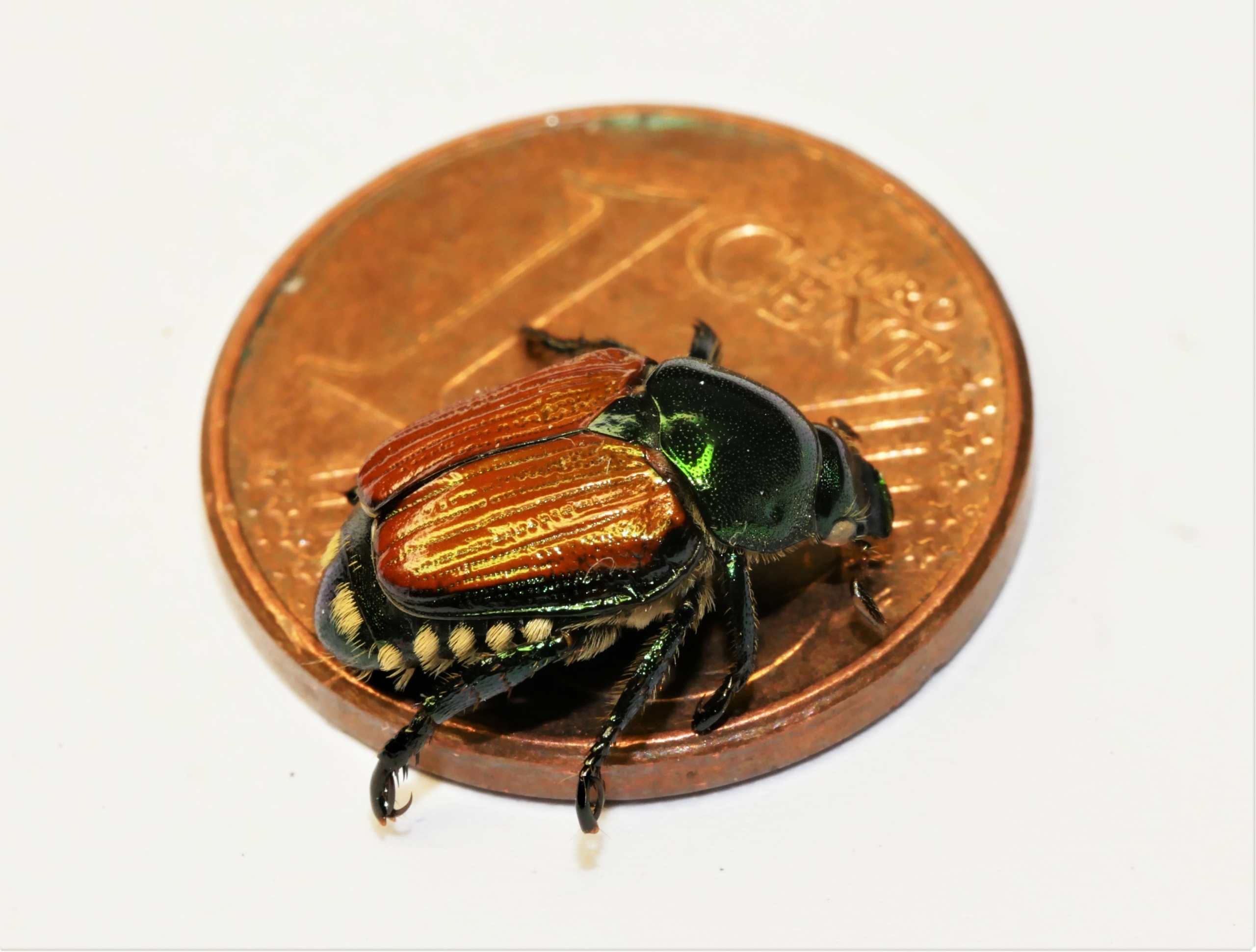 Der Japankäfer ist nur circa einen Zentimeter groß, kleiner als eine Cent-Münze. Er hat einen metallisch glänzenden, grünen Kopf und braune Flügel. Sein besonderes Merkmal sind fünf weiße Haarbüschel an jeder Hinterleibseite und zwei weiße Haarbüschel am Ende des Hinterleibs.